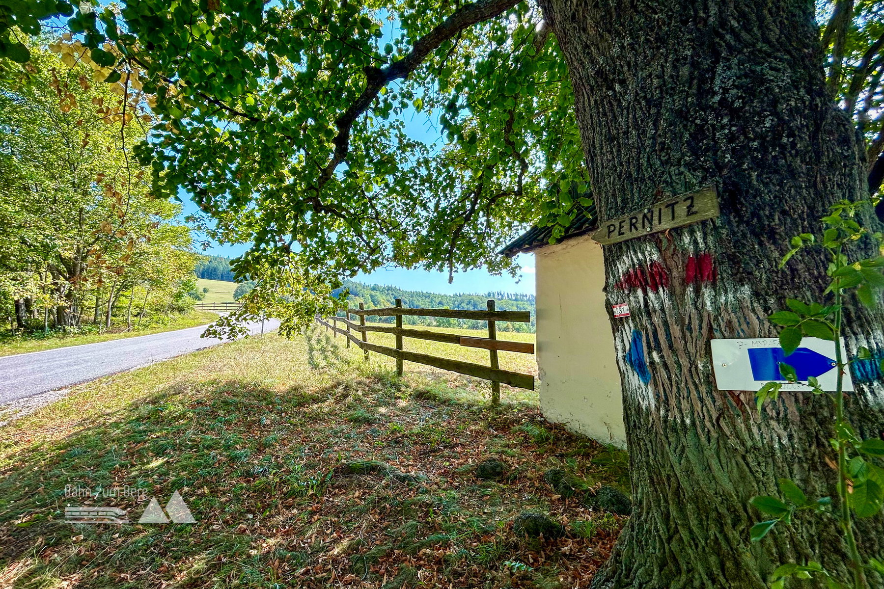 An der Straßenkreuzung beim Jagasitz steht eine große Sommerlinde und unter ihren Zweigen versteckt sich der Wegweiser nach Pernitz. Diesem folge ich auf der Straße ein kurzes Stück bergauf um beim nächsten Schilderbaum rechts abzubiegen. Nach einer schönen Wiese auf den Wald zu. In diesem findet man zahlreiche Schwarzföhren mit eingekerbten Rinden, sie dienten früher der Pechgewinnung.