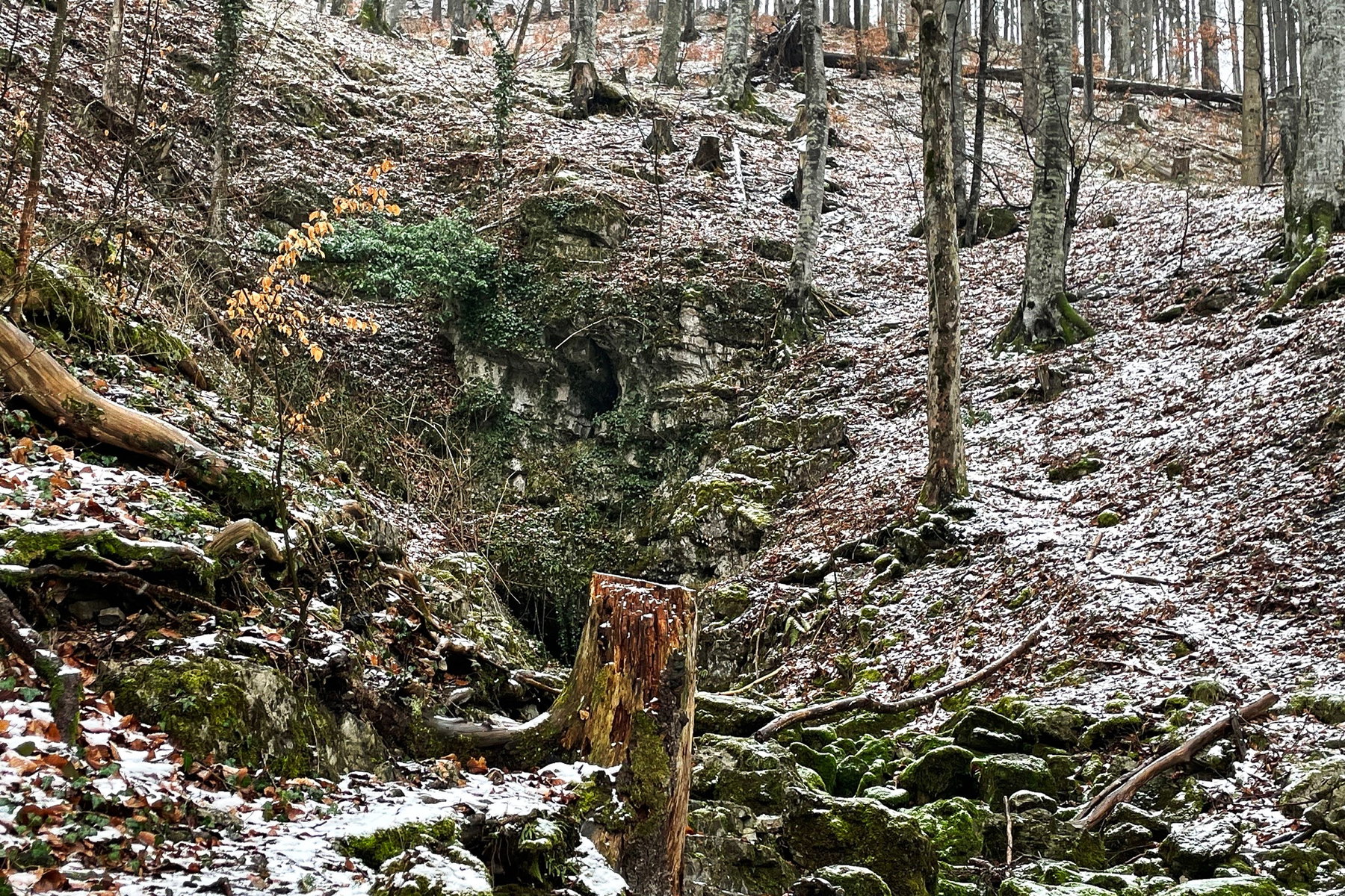 Ein paar Kilometer weiter, gibt es wieder eine Option nach rechts über das Drahtal zum Unterberg, aber ich bin die rote Markierung weiter gegangen zur Myralucke, eine Höhle, aus der der Myrabach entspringt, der die Myrafälle bei Muggendorf bildet.