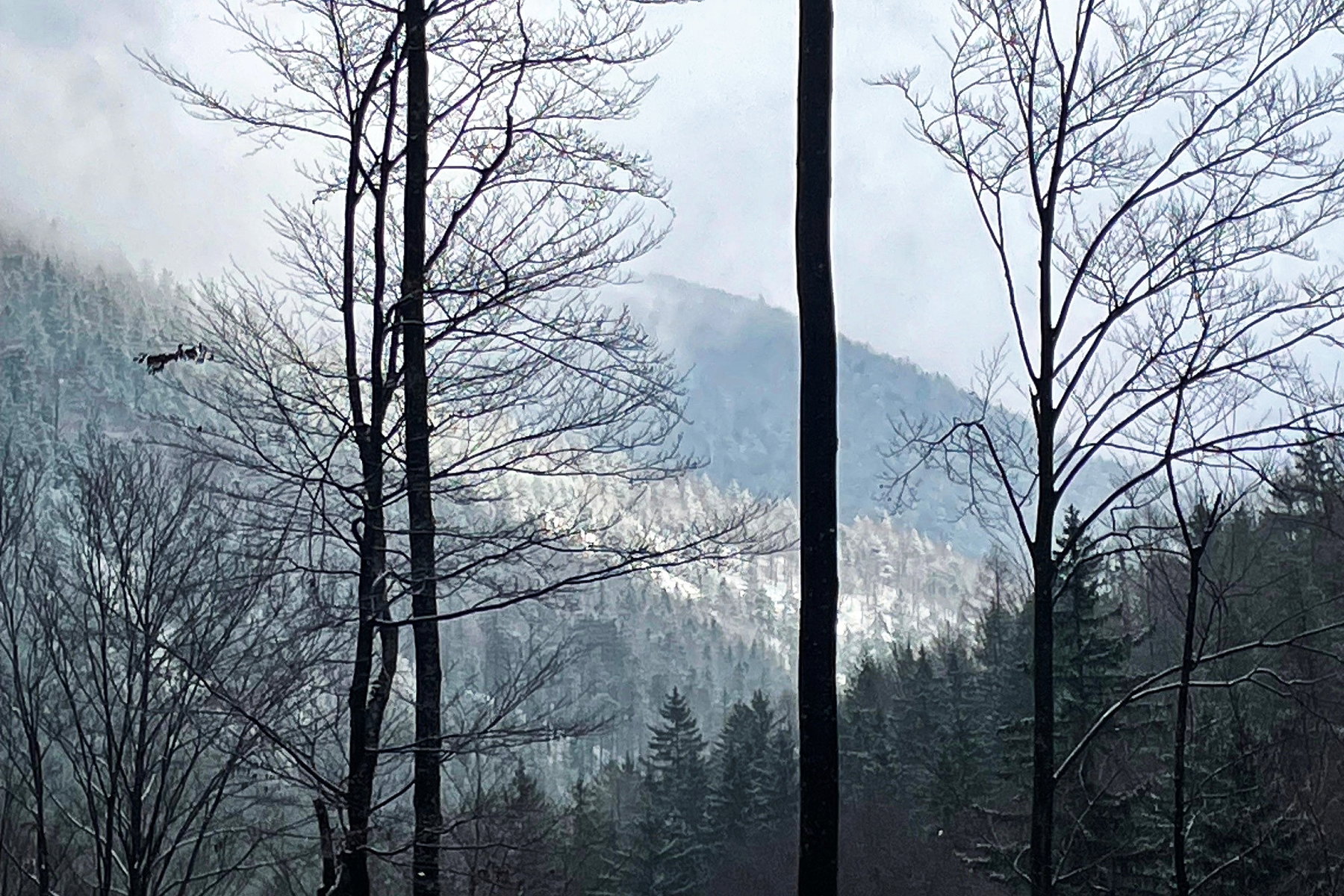 Der Waldweg, im Schnee etwas rutschig, quert immer wieder eine Forststrasse, von der man einen wunderschönen Blick hat und für mich ist sogar kurz die Sonne rausgekommen!