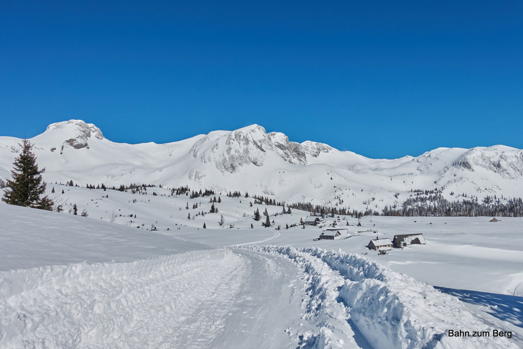Vom Parkplatz führt der Weg nördlich der Jassingalm vorbei. Die Russenstraße selbst ist mit einem Kettenfahrzeug präpariert worden. Der Weg liegt teilweise auf dieser geräumten Strecke, teilweise kürzt er dazwischen mittels direkter Linie ab. Es geht stetig bergauf, aber durchwegs mit moderater Steigung.