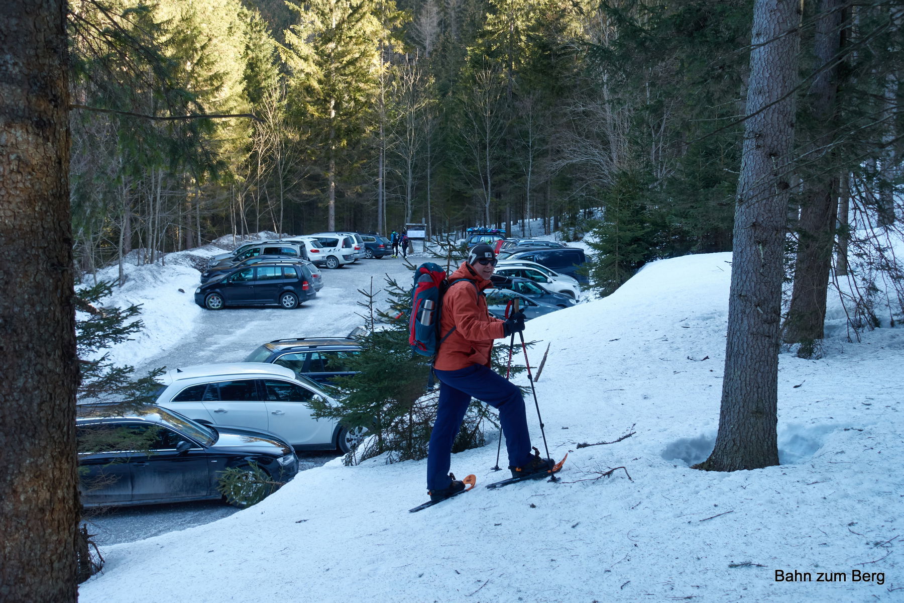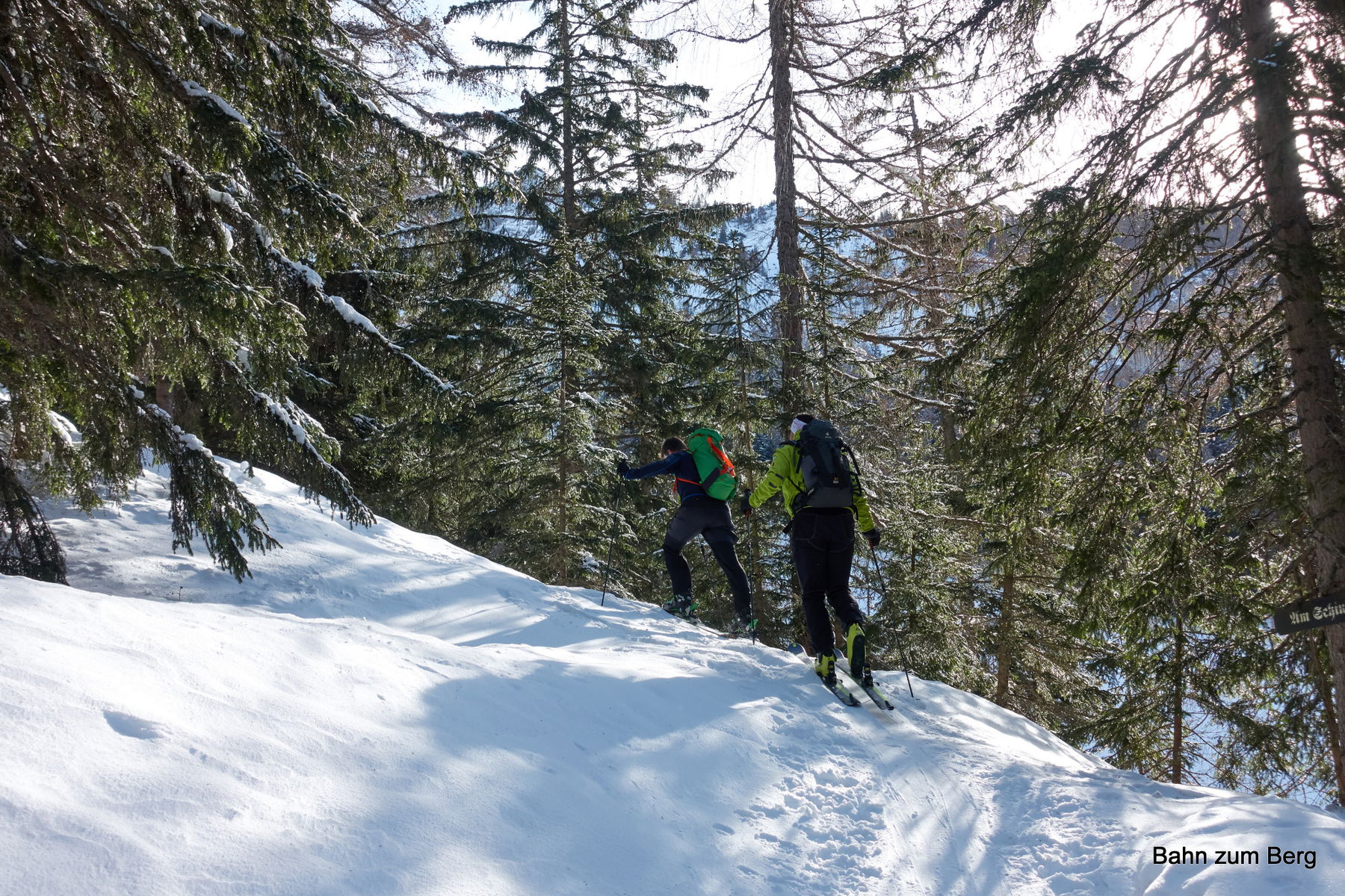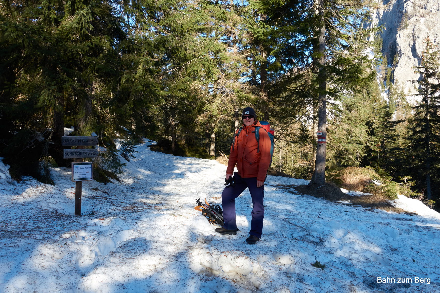So müssen wir nur die kurze Strecke vom Parkplatz vor dem Grünen See bis zur scharfen Kehre der Straße nach links tragen. Dort zweigt der Wanderweg geradeaus ab und es liegt ab dort durchgängig Schnee.