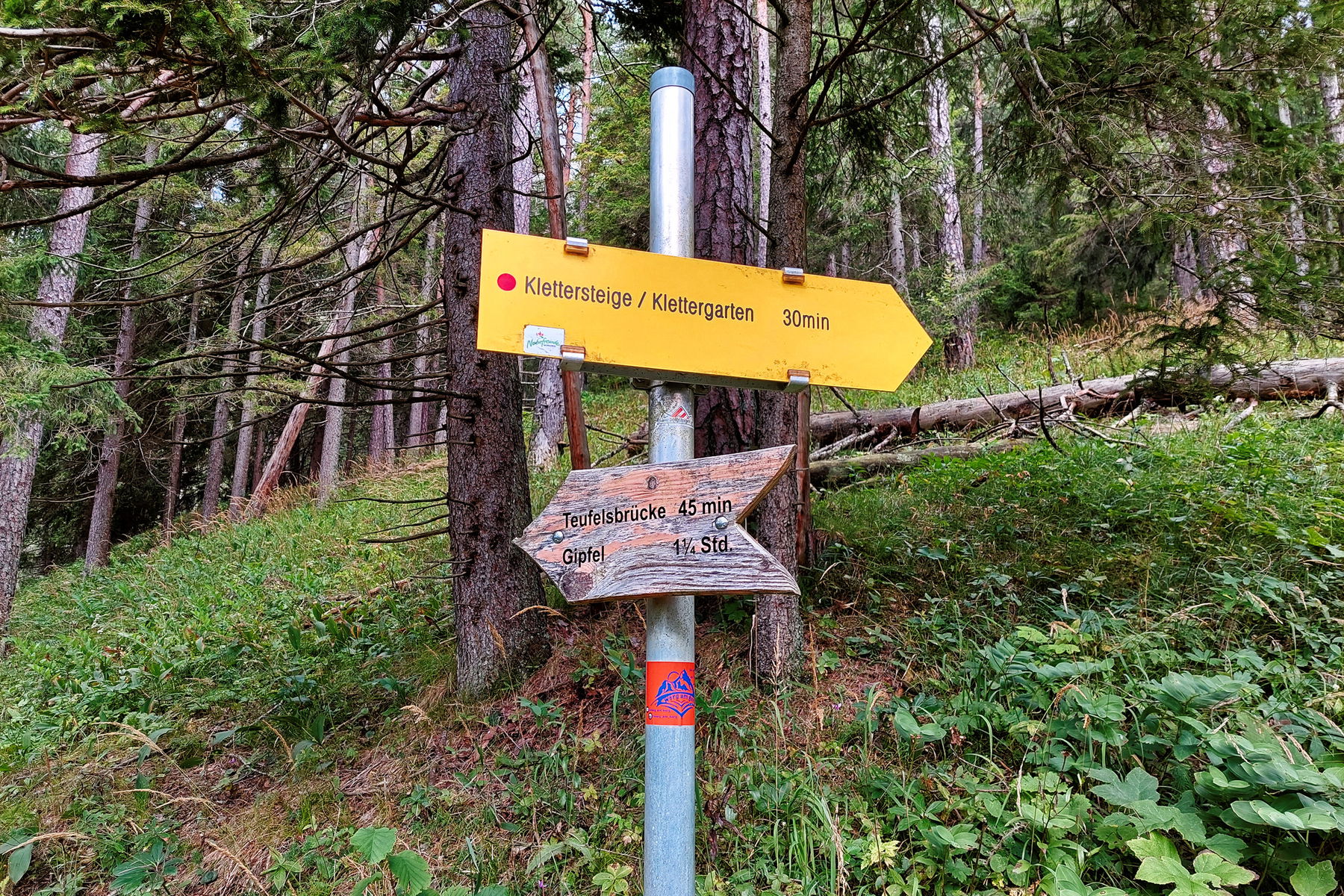 Von der Haltestelle gehe ich um circa 8:30 Uhr den Wanderweg entlang über ein Bächlein, dann links, bei der nächsten Abzweigung rechts und kurz darauf wieder links in den Wald hinein. Die Abzweigungen sind gut beschildert und der Wanderpfad im Wald ist ausreichend markiert. Nach ungefähr einer Viertelstunde gelange ich zur Abzweigung zu den Klettersteigen: rechts halten. Die Tafel gibt eine Zustiegszeit von weiteren 30 Minuten an, die ich in etwa einhalte. Der Weg führt meistens durch den Wald über Wurzeln und ist mit circa 250 Höhenmetern eher knackig, sodass ich bald die erste Schicht ausziehen muss.