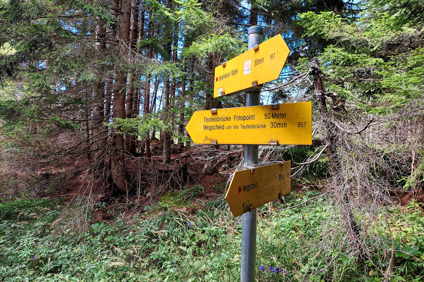 Am Ende des Steiges gelange ich direkt zum Wanderweg mit einem Wegweiser. Nach links ist der Abstieg nach Wegscheid beschriftet, nach rechts geht’s in nicht mal 10 Minuten zum Gipfel. Ich mache hier erstmal eine kurze Verschnauf- und Essenspause. Da ich mich entscheide auch noch den Kirchbogensteig zu klettern, steige ich zuerst ab und nehme mir den Gipfel für später vor. Wer nach einem Klettersteig genug hat, dem empfehle ich den Gipfel. Dort gibt’s eine Sitzbank und ein Gipfelkreuz, von welchem ich leider kein Foto gemacht habe.