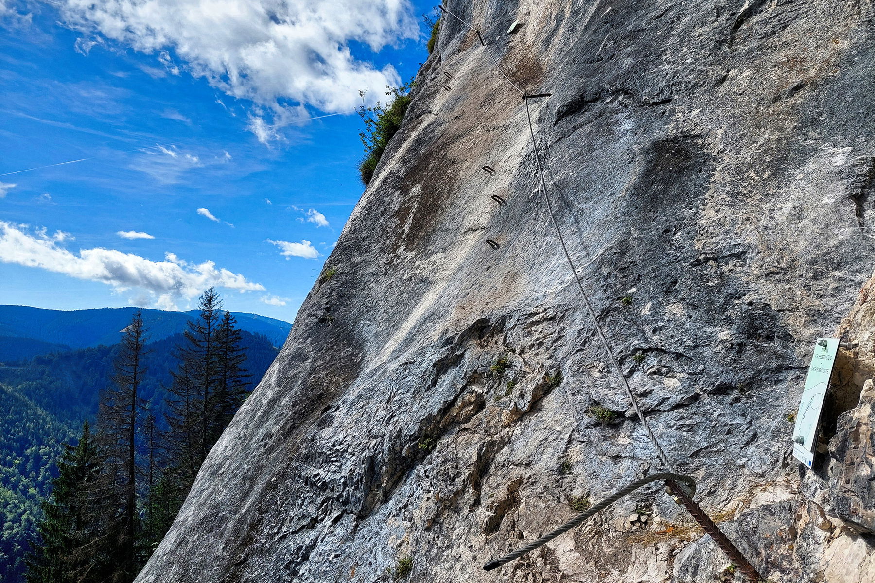 Der Klettersteig ist wie in der Topografie beschrieben und durchgehend mit Stahlseil versichert. Es gibt auch an sehr vielen Stellen Stahltritte, die das Klettern erleichtern. Kurz vor meinem Start ist auch die Sonne rausgekommen, welcher ich dann fast den ganzen Steig lang ausgesetzt bin. Die Kletterer vor mir hole ich nach einer Weile ein, bei der Abzweigung zur schwierigen Variante kann ich an ihnen vorbeiklettern, da sie links den leichten Mariazeller Klettersteig wählen. Die Himmelsleiter, die bereits vor der Abzweigung zu sehen ist, ist für mich definitiv ein Highlight. Die Strickleiter ist recht wackelig und wer es nicht gerne so luftig unter den Füßen hat, der sollte sie die schwere Variante lieber nicht klettern. Kurz danach gibt’s die einzige D-Stelle (laut Topo), die mir nicht wesentlich schwieriger vorkommt. Bis zum Ende des Klettersteigs ist es jetzt nicht mehr weit. Ich brauche für den beschriebenen Steig circa 50 Minuten und bin um circa 10:15 Uhr beim Wegweiser.
