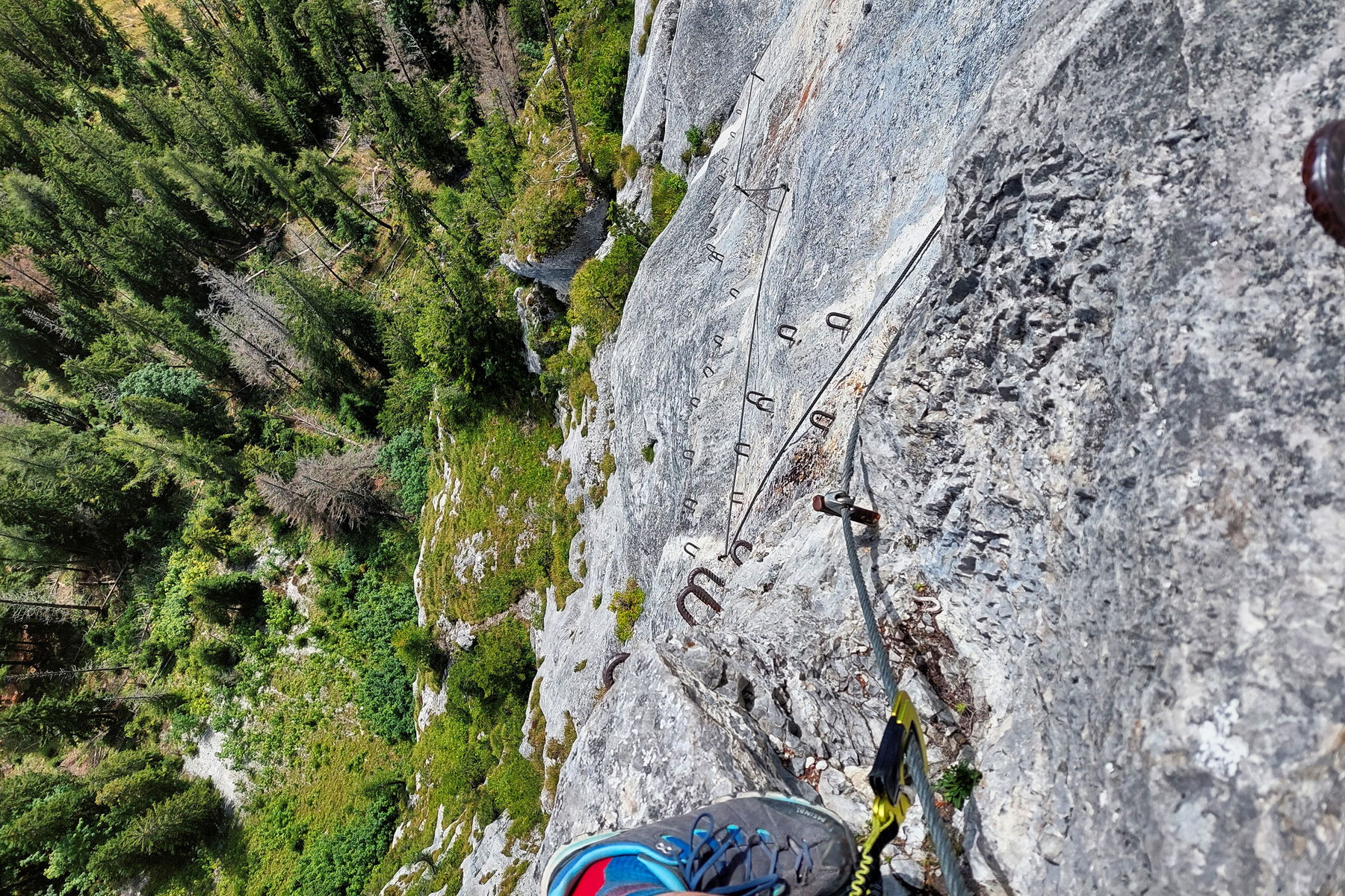 Links: Ausblick auf Felsformationen im Klettersteig. Rechts: Blick auf Felix´ Himmelsleiter von unten mit den Kletterern vor mir. Fotos: Alice Frischherz