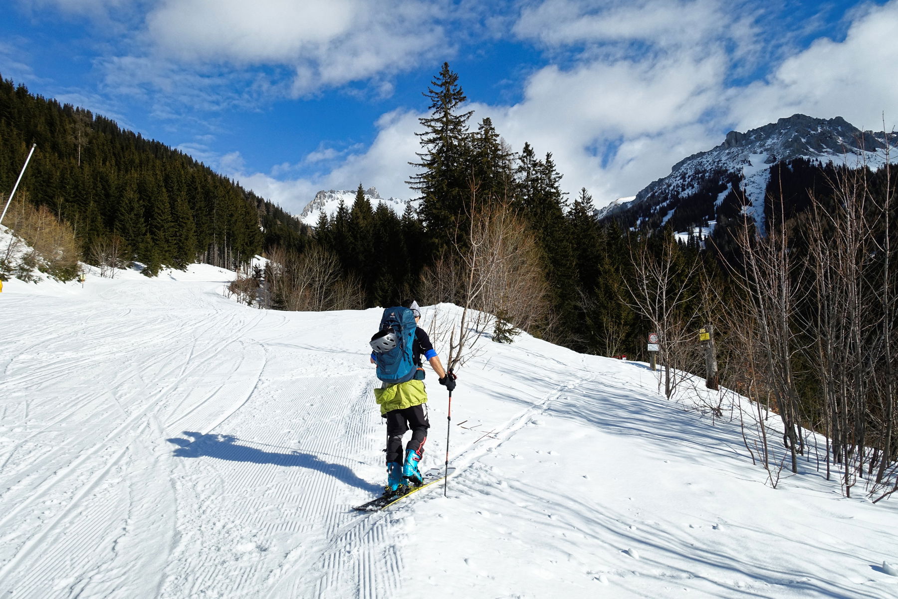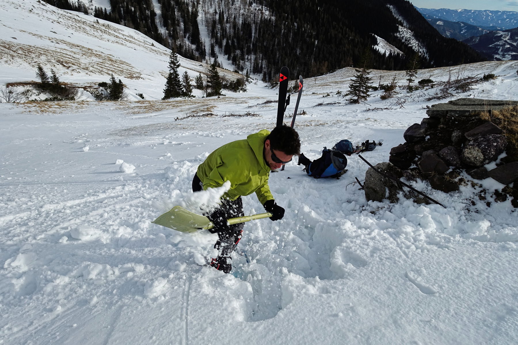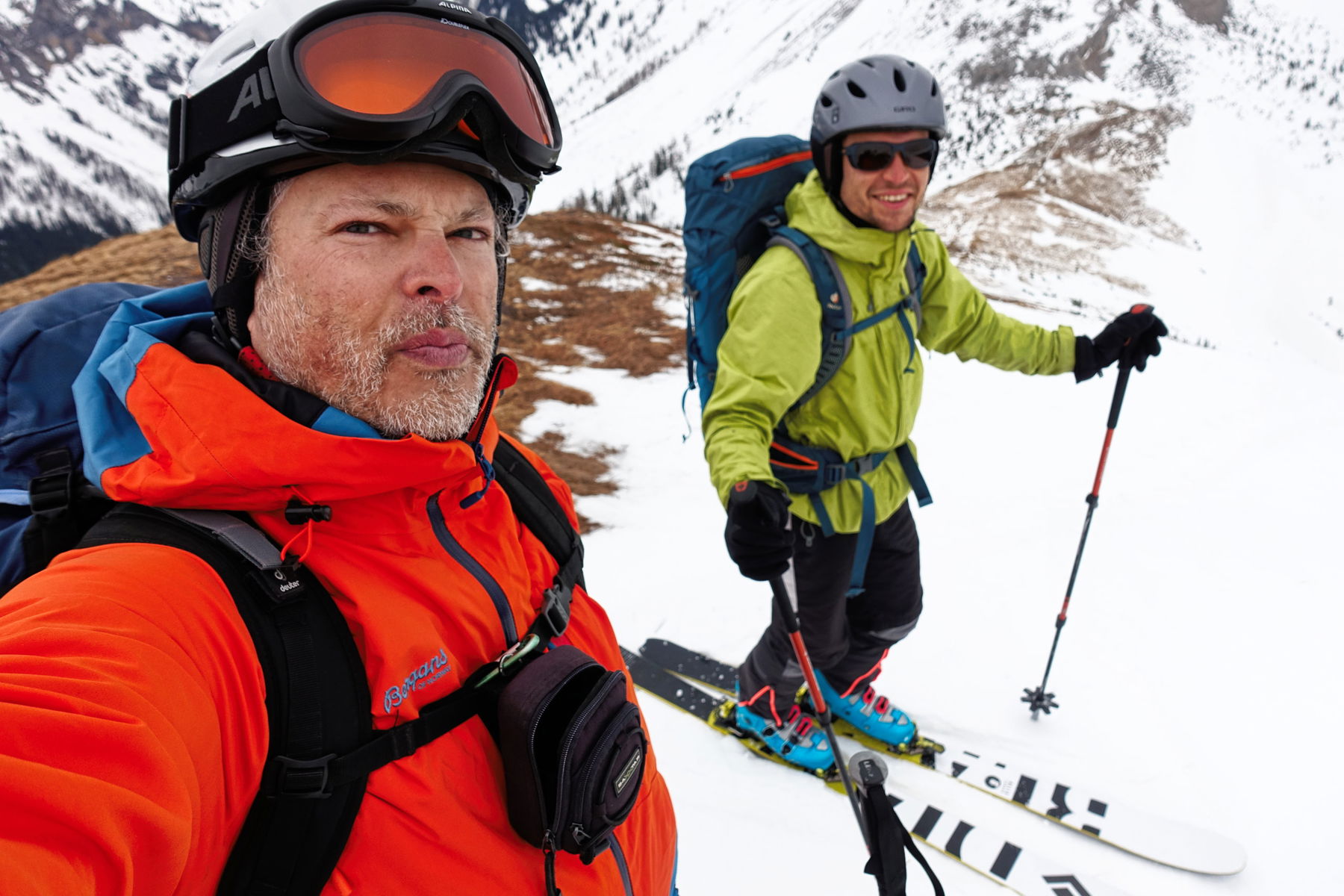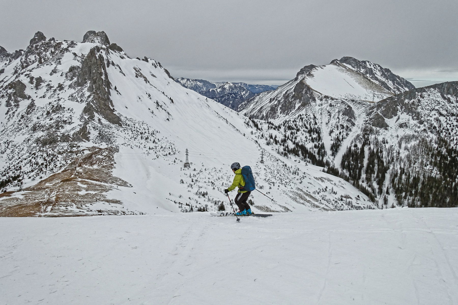 Wieder mit den Tourenski an den Füßen sucht man sich die beste Spur zum Abfahren, abhängig von den Schneeverhältnissen. Die Schleife um die Leobner Hütte haben wir nun enger gezogen.