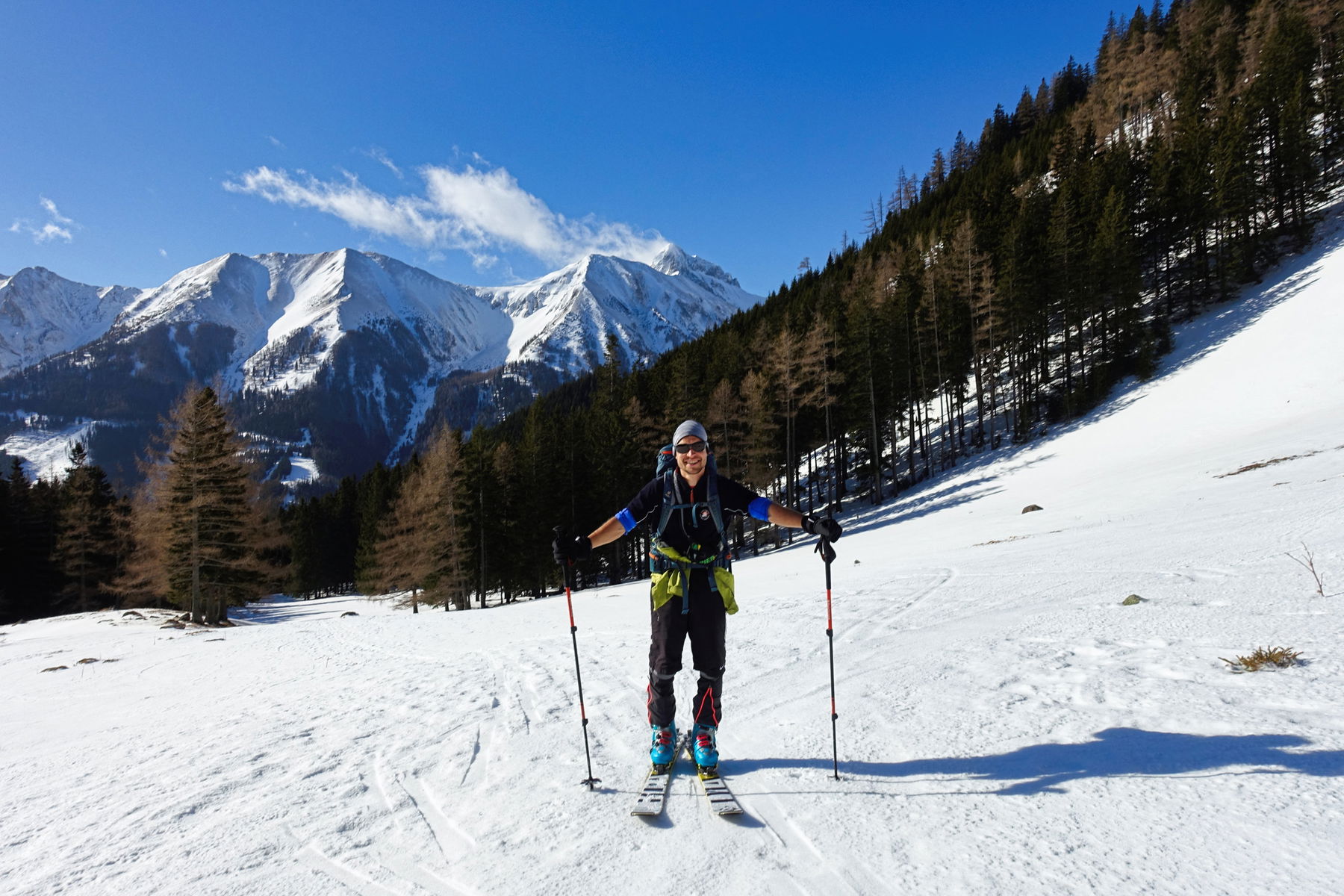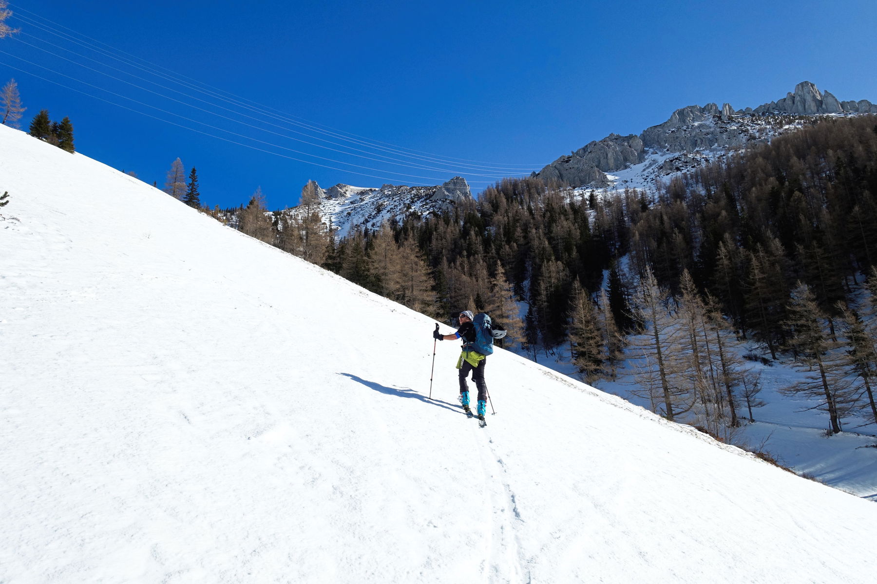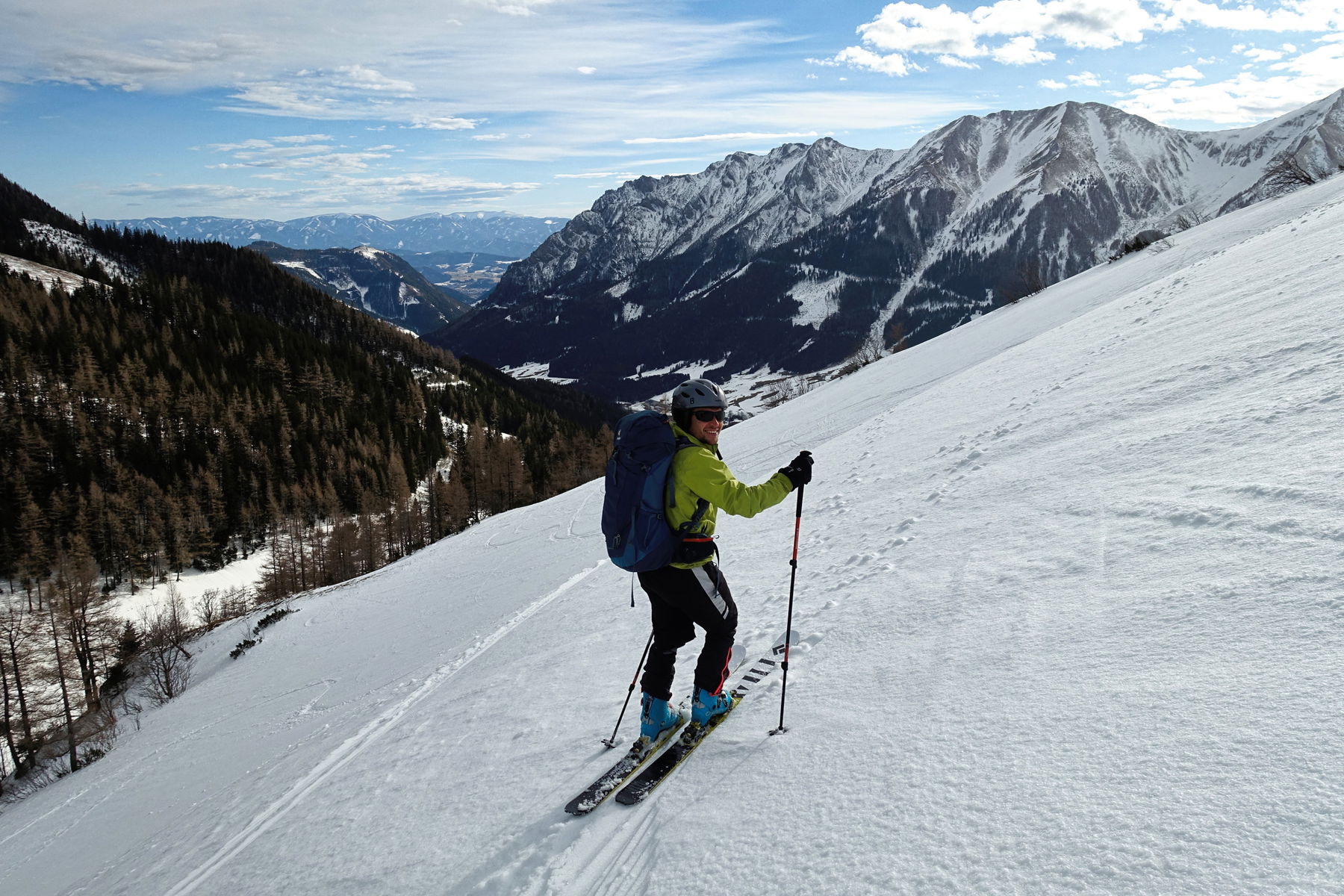 Nach einer kleinen Rast in der Sonne und einer Schneeprofil Grabung nahe der Leobner Hütte geht es zuerst einen Nordosthang, dann in einer schmalen flachen Rinne Richtung Osten bergab. An dessen Ausfahrt quert man den Hang Richtung Süden bis zu einem lichten Lärchenwald. Entweder man fährt hier durch den Wald (etwa in mittlerer Höhe ändert man mit einer Linkskurve die Fahrtrichtung) ab oder direkt linker Hand des Lärchenwaldes über eine sehr steile Geländekante. Zweitere Variante sollte nur bei sicheren Lawinenverhältnissen und guter Skitechnik im Tiefschnee in Angriff genommen werden.