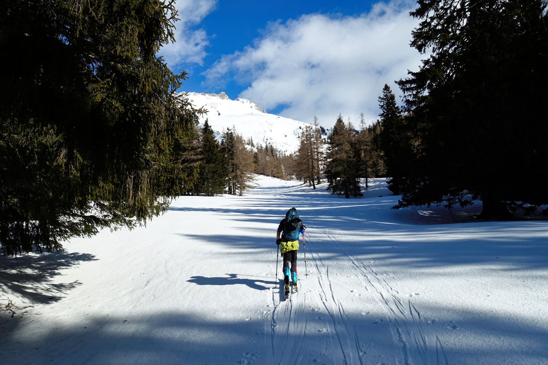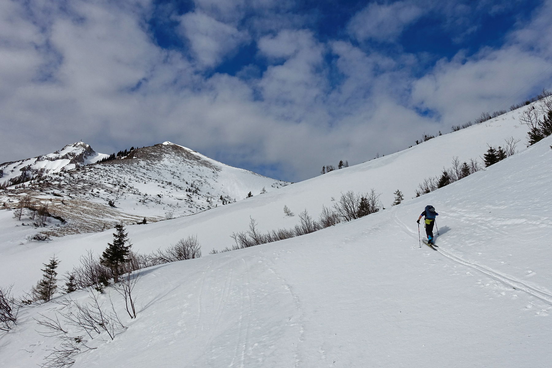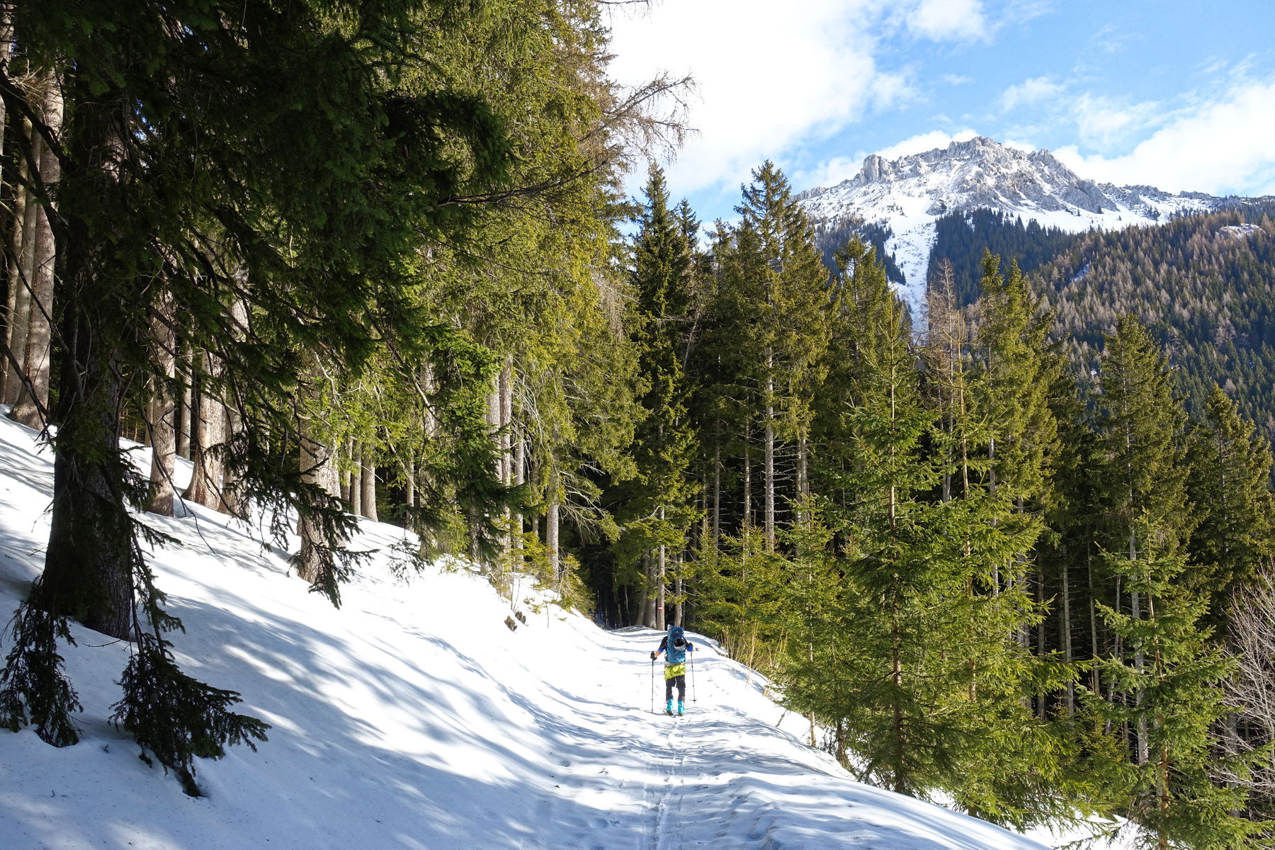 Nach einer kleinen Rast in der Sonne und einer Schneeprofil Grabung nahe der Leobner Hütte geht es zuerst einen Nordosthang, dann in einer schmalen flachen Rinne Richtung Osten bergab. An dessen Ausfahrt quert man den Hang Richtung Süden bis zu einem lichten Lärchenwald. Entweder man fährt hier durch den Wald (etwa in mittlerer Höhe ändert man mit einer Linkskurve die Fahrtrichtung) ab oder direkt linker Hand des Lärchenwaldes über eine sehr steile Geländekante. Zweitere Variante sollte nur bei sicheren Lawinenverhältnissen und guter Skitechnik im Tiefschnee in Angriff genommen werden.