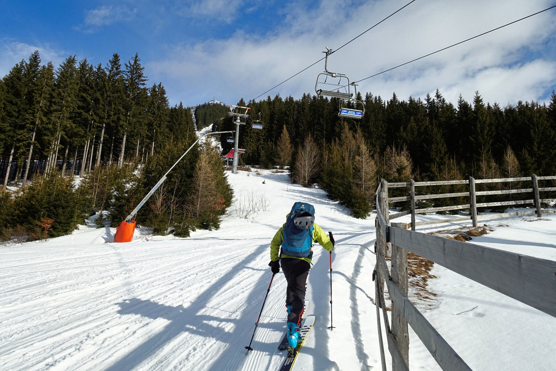 Die ersten Höhenmeter bewältigen wir auf der Piste 05 unter dem Polster Quattro Sessellift und unter der neuen Bundesstraße hindurch. Immer am rechten Rand der Piste folgend (Bitte an unübersichtlichen und engen Stellen hintereinander gehen) überquert man in einer Linkskurve die Laufstraße, die zum Gehöft und Skitourenparkplatz der Handlalm führt.