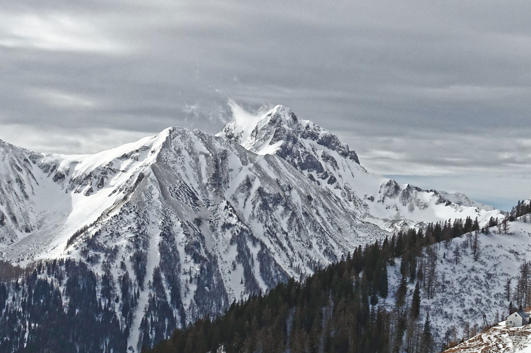 Entlang des Handlgrabens wird im oberen Bereich der Wald immer lichter. Über tief verschneite Almwiesen steigen wir bis zum Talschluss auf. Dort folgen wir weiter den Markierungen des Wanderweges zur Leobner Hütte.