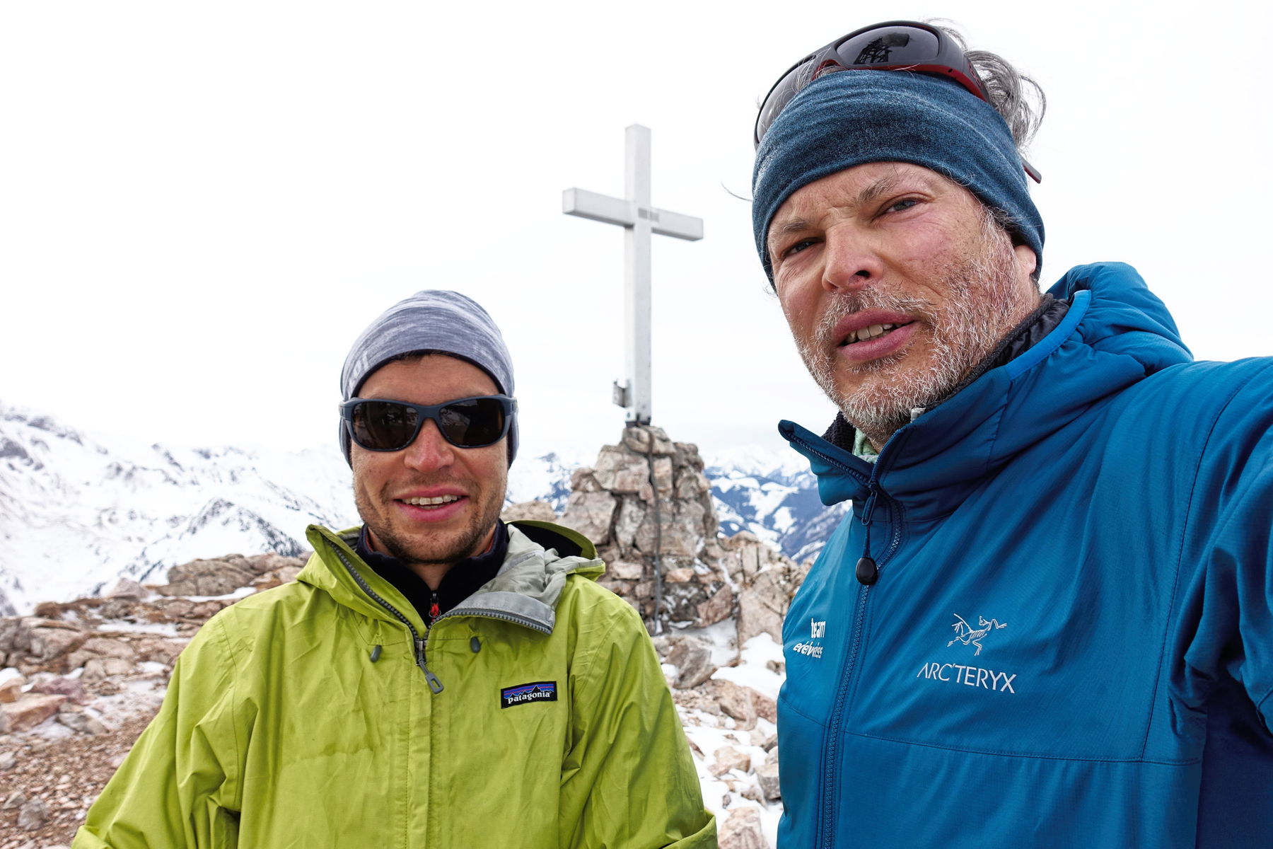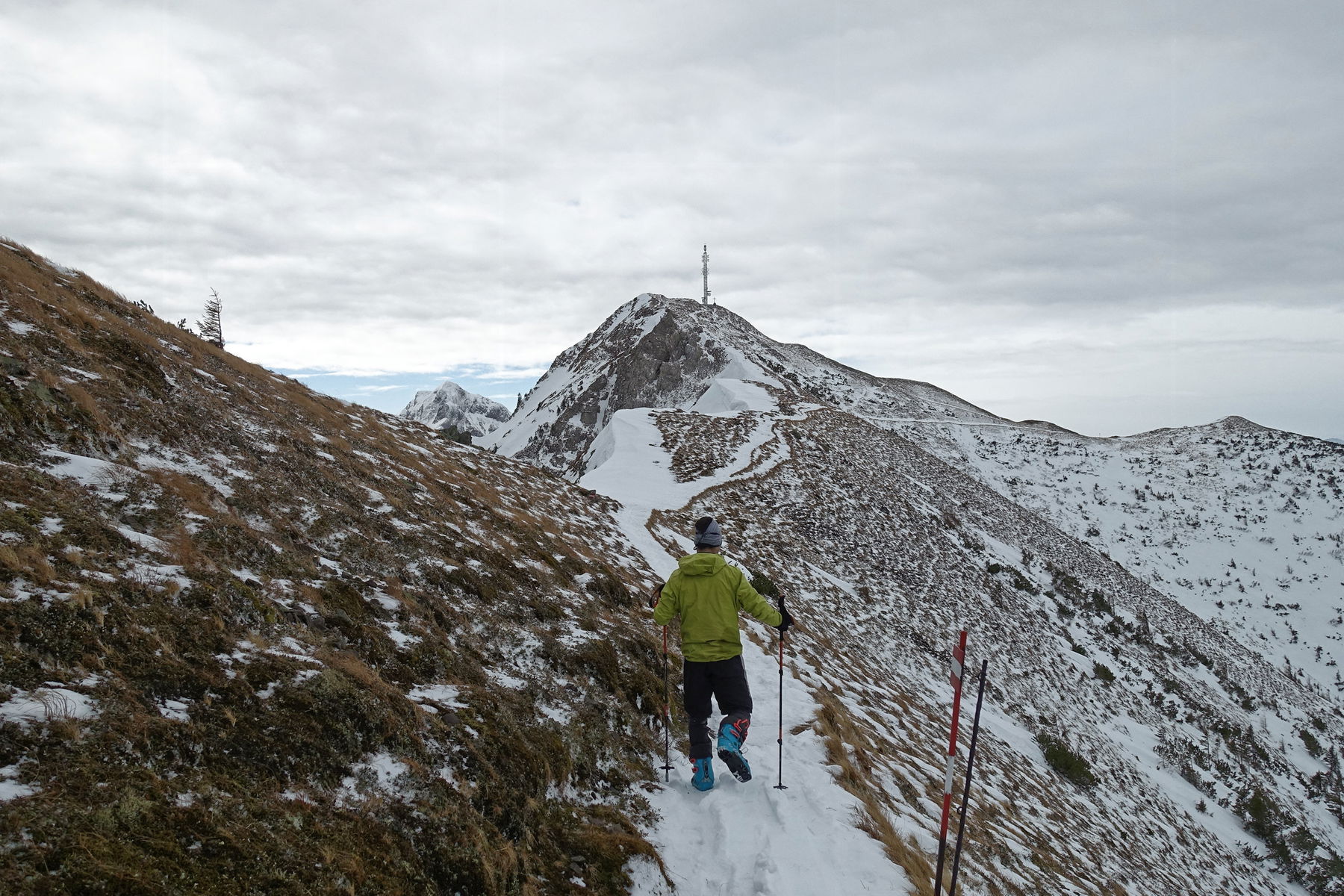 Nun folgen wir dem Rücken des Berges Richtung Süden bis wir einen weiteren Sattel erreichen. Von dort aus kann man bereits den Sender und das kleine Kreuz des Polster Gipfels erspähen. Nachdem die Tragelast von 10 kg Rucksack samt Inhalt auf das Gewicht der Tourenski erhöht wurde, beschlossen wir ohne dem Marschgepäck die letzten Meter bis zum Gipfel zu erklimmen.