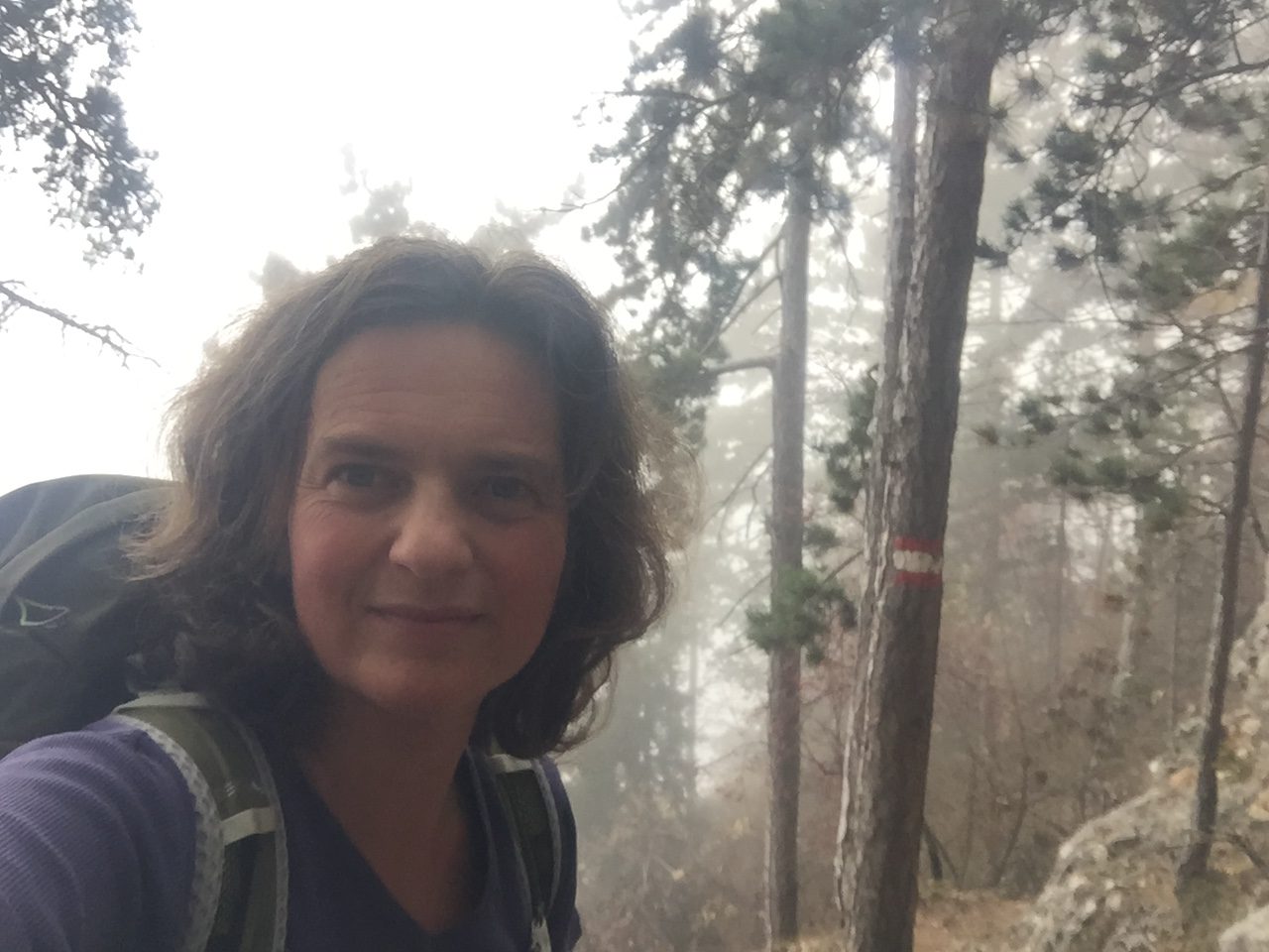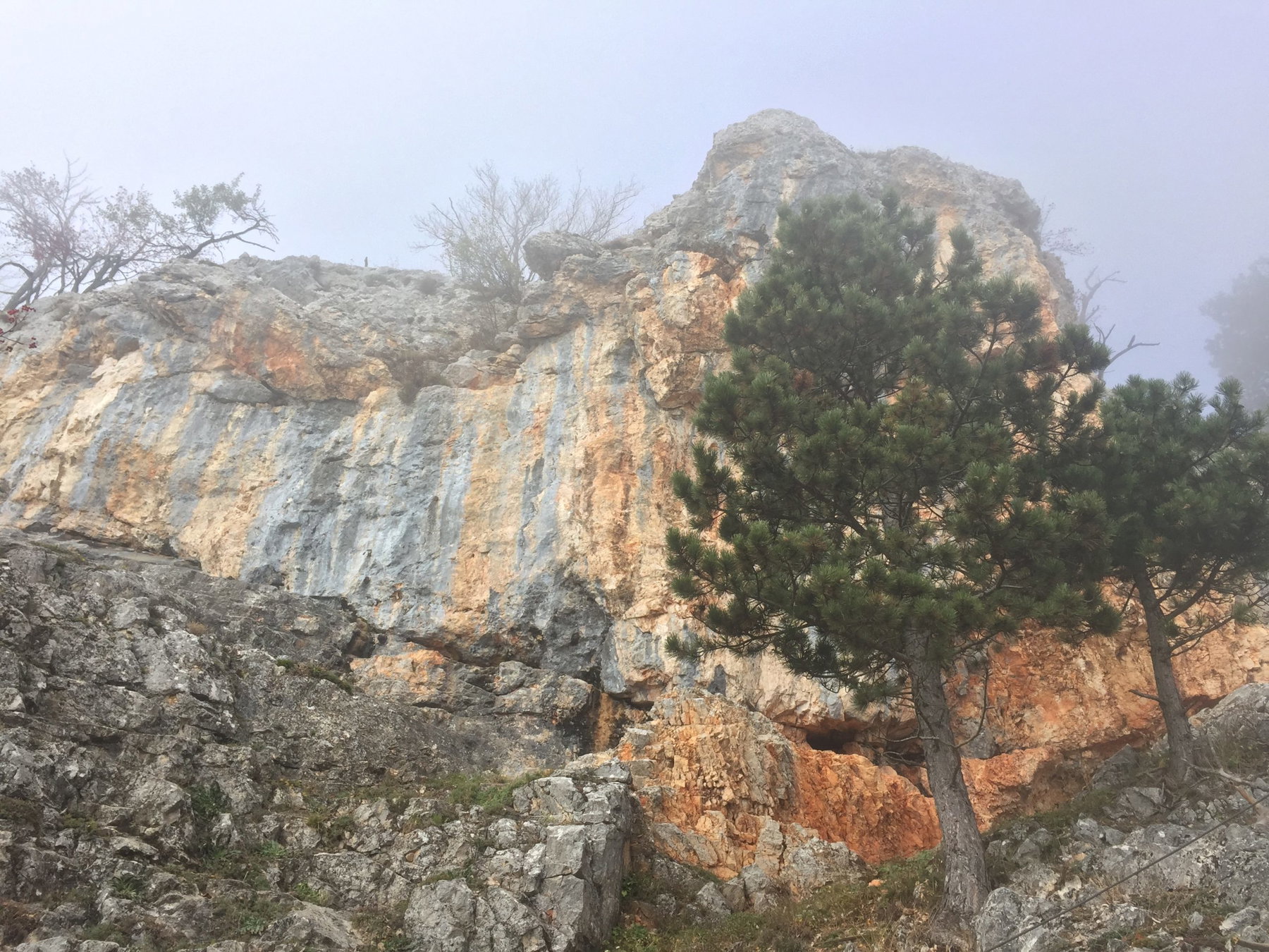 Bei der Metallleiter unter der Wandkrone ist das beste Fotomotiv, um vor einer Felswand zu posen. Und schon sind wir oben beim Hubertushaus, das zum Rasten einlädt. Spätestens jetzt sollten wir über der Nebeldecke stehen! (Falls nicht, nächstes Mal den Wetterbericht genauer studieren).