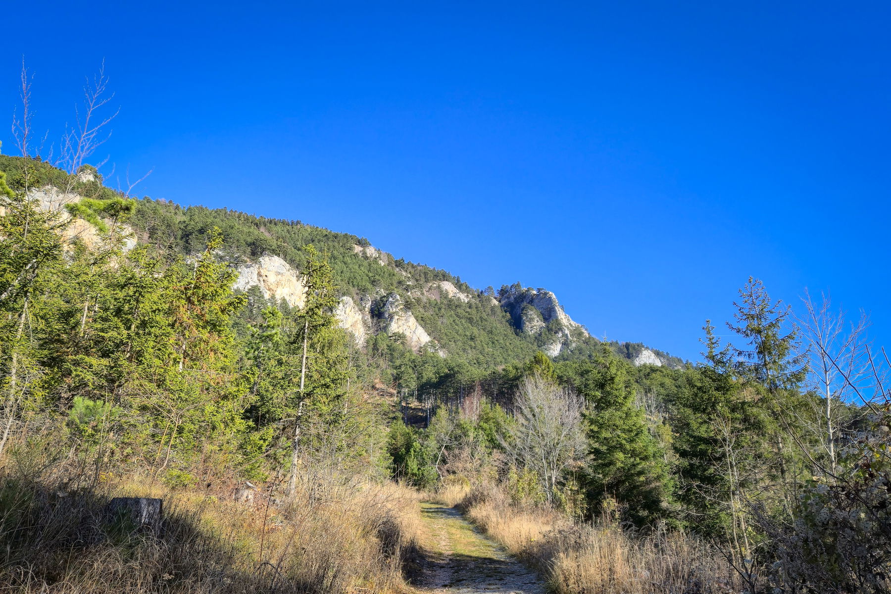 Nach der Pause geht es weiter Richtung Geländ, über das Plackles. Von der Hütte folgt zuerst noch ein kurzer Aufstieg bis zum Plackles über Forststraßen, bevor es dann erstmal bergab geht. Der Weg bleibt auf der Forststraße, geht durch den Wald und ist gut markiert/ausgeschildert (immer Richtung Rastkreuz und/oder Geländ). Vom Plackles erreiche ich nach etwa 2 Kilometern das Rastkreuz von wo es weiter zum Geländ geht. Hinter einem Haus vorbei komme ich bald an eine Lichtung und biege nach der Lichtung leicht links nach oben weg in den Wald und es folgt der letzte steilere Aufstieg.