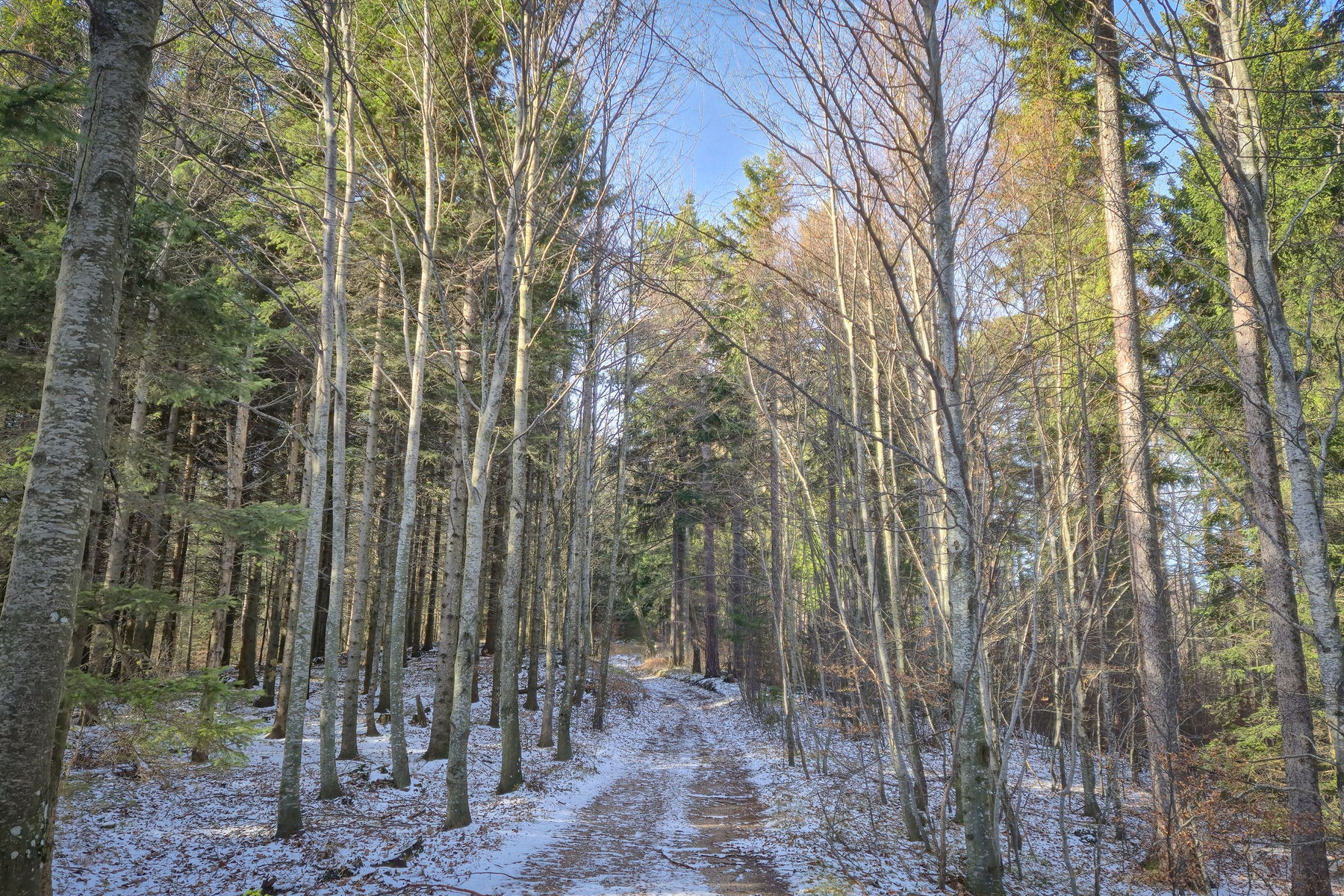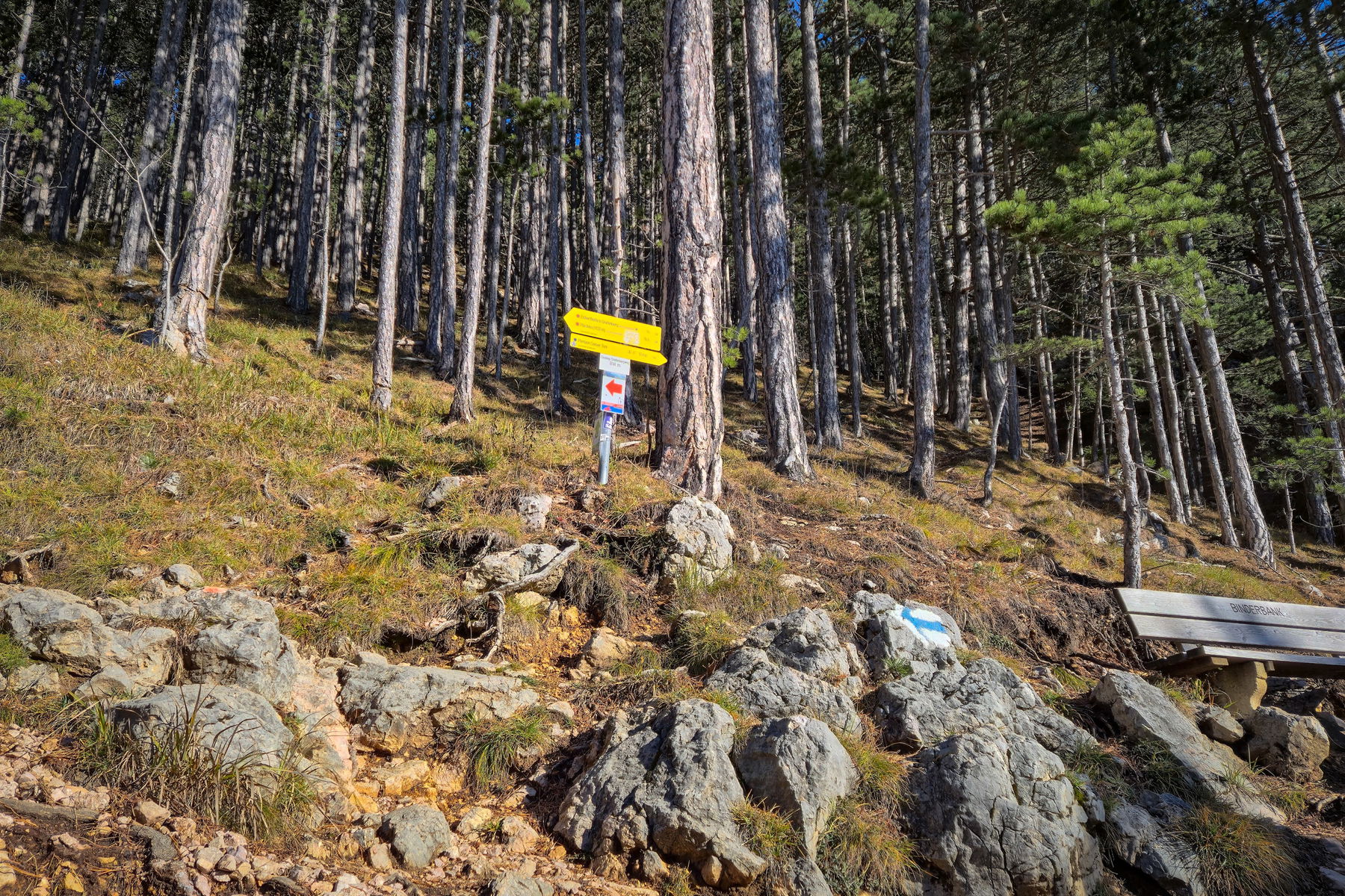 Die Tour startet am Bahnhof Grünbach, wo ich zuerst die Gleise überquere und der „Neusiedlerstraße“ für etwa 200 Meter folge, bevor ich nach links in einen Forstweg einbiege (Wegbeschilderung zur Pension „Seiser Toni“). Ab hier geht es direkt bergauf entlang der Forststraße bis ich an eine asphaltierte Straße stoße (Amadesweg), welcher ich nach rechts folge. Ich bleibe auf dieser Straße und folge der blauen Wegmarkierung. Nach etwa einem Kilometer sehe ich einen Parkplatz und biege leicht links ab (Wegbeschilderung zur Eicherthütte und weiterhin blaue Markierung).