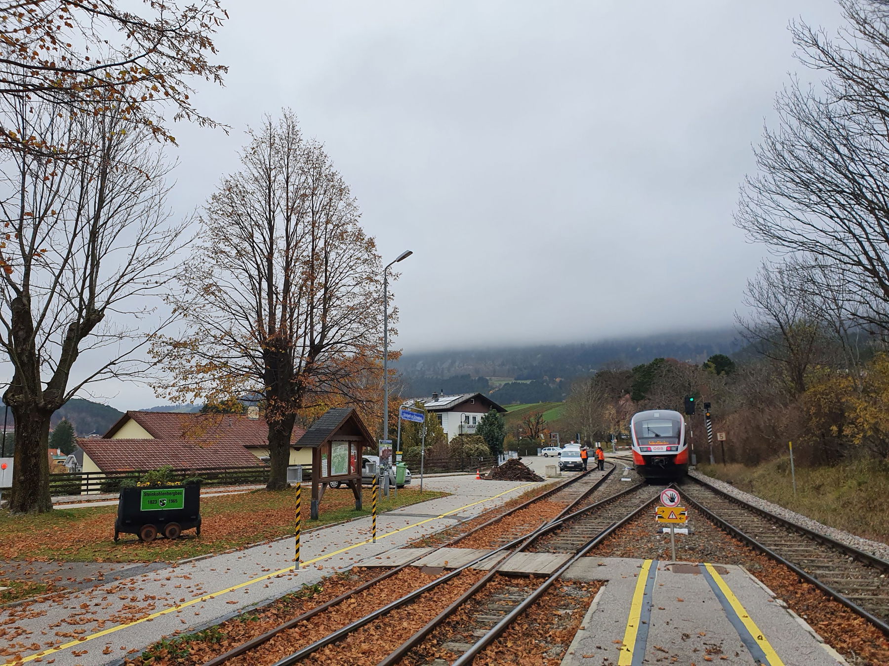 Aus all diesen Gründen entscheiden wir uns, zurück zur Scheimhütte zu wandern und beim Rastkreuz über den Bergmannsteig (steiler rutschiger Waldweg, unfreiwilliger Bodenkontakt meiner vier Buchstaben inklusive) nach Grünbach abzusteigen. Wir kommen beim Sportplatz aus dem Wald und folgen dem Wanderpfeil zur Bahnhaltestelle Grünbach Schule. Die Züge fahren stündlich nach Wiener Neustadt und wir haben Glück und können bald einsteigen. Übrigens gibt es in der Puchberger Bahn Fahrschein-Automaten im Zug, also kein Stress, wenn man am Bahnhof keinen Automaten findet.