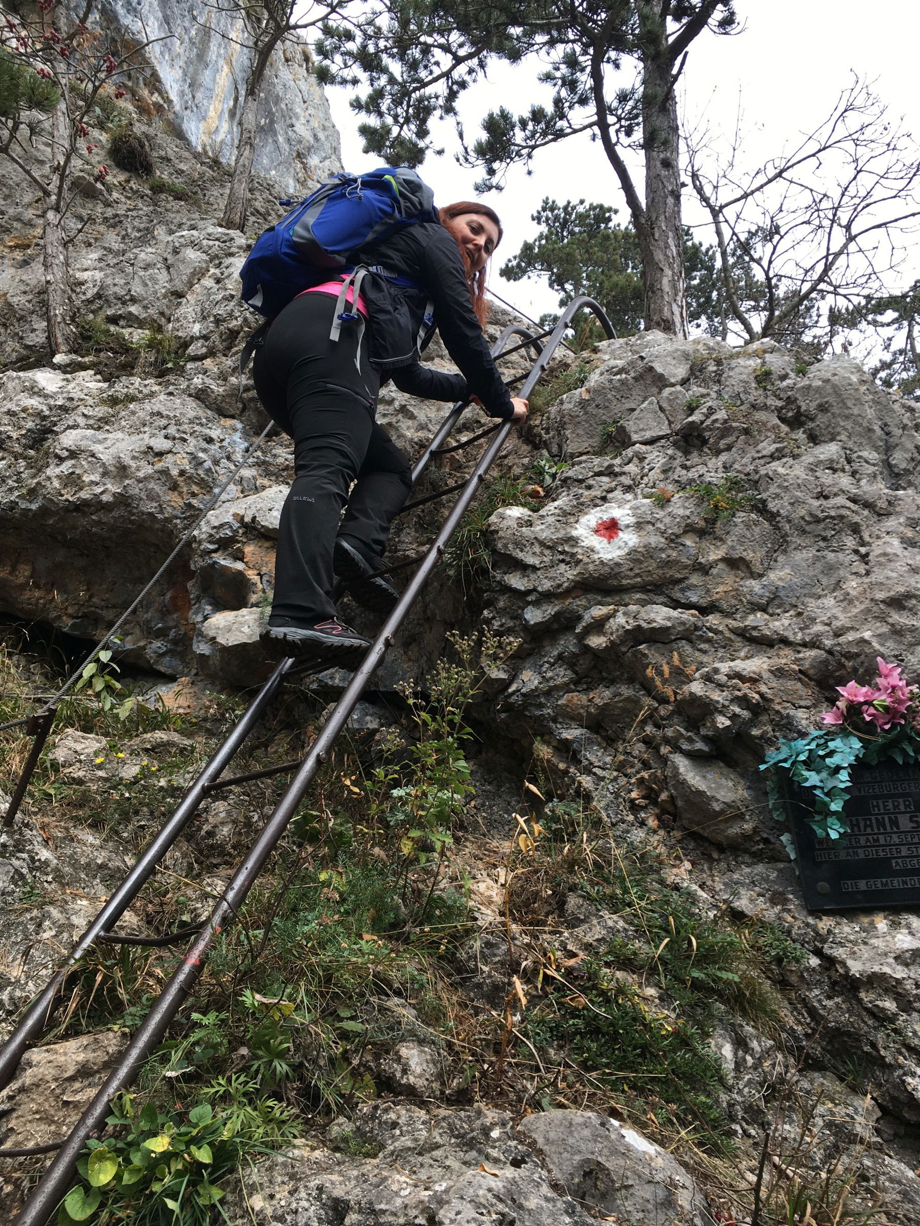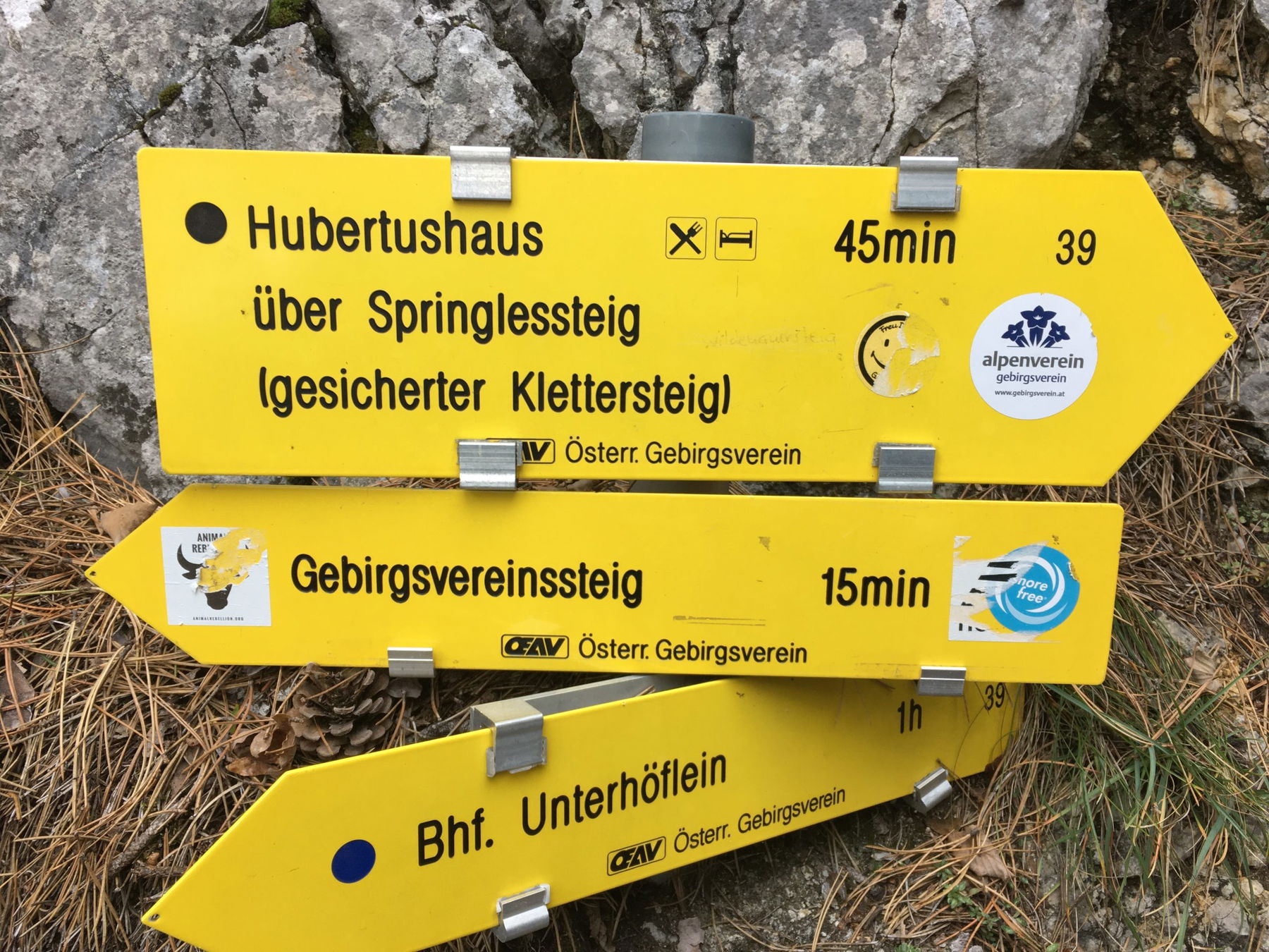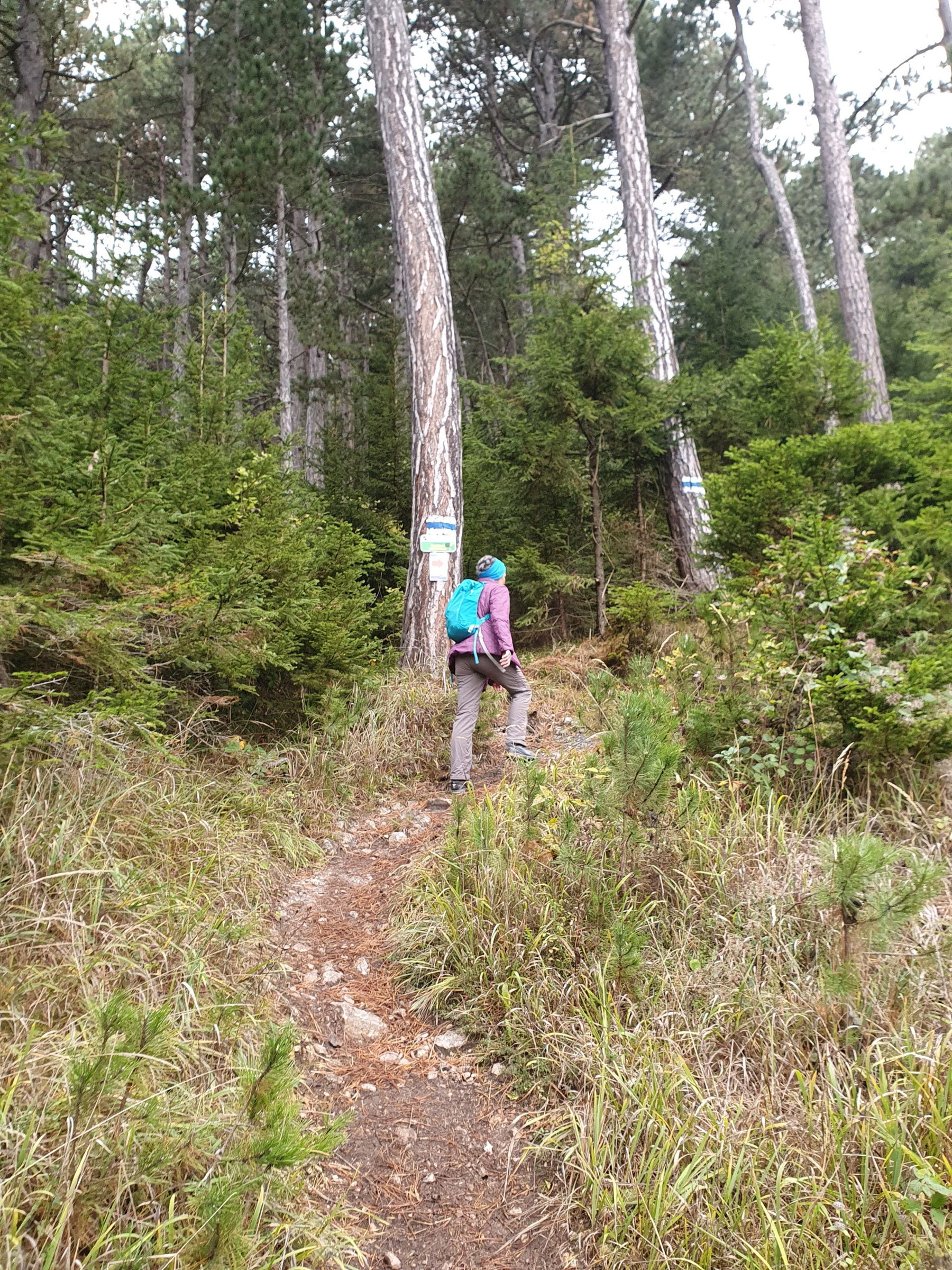 Über eine Wiese gehts geradewegs auf die Hohe Wand zu, dann über ein Sträßlein durch eine Siedlung, bergauf weiter auf einem Waldweg und über eine Forststraße, von der wir beim Binderbankerl nach links abbiegen, um den Wandfußsteig zu erreichen. Wie der Name sagt, führt dieser Weg immer an der Wand lang, von ihm zweigen zahlreiche Klettersteige und -routen ab.