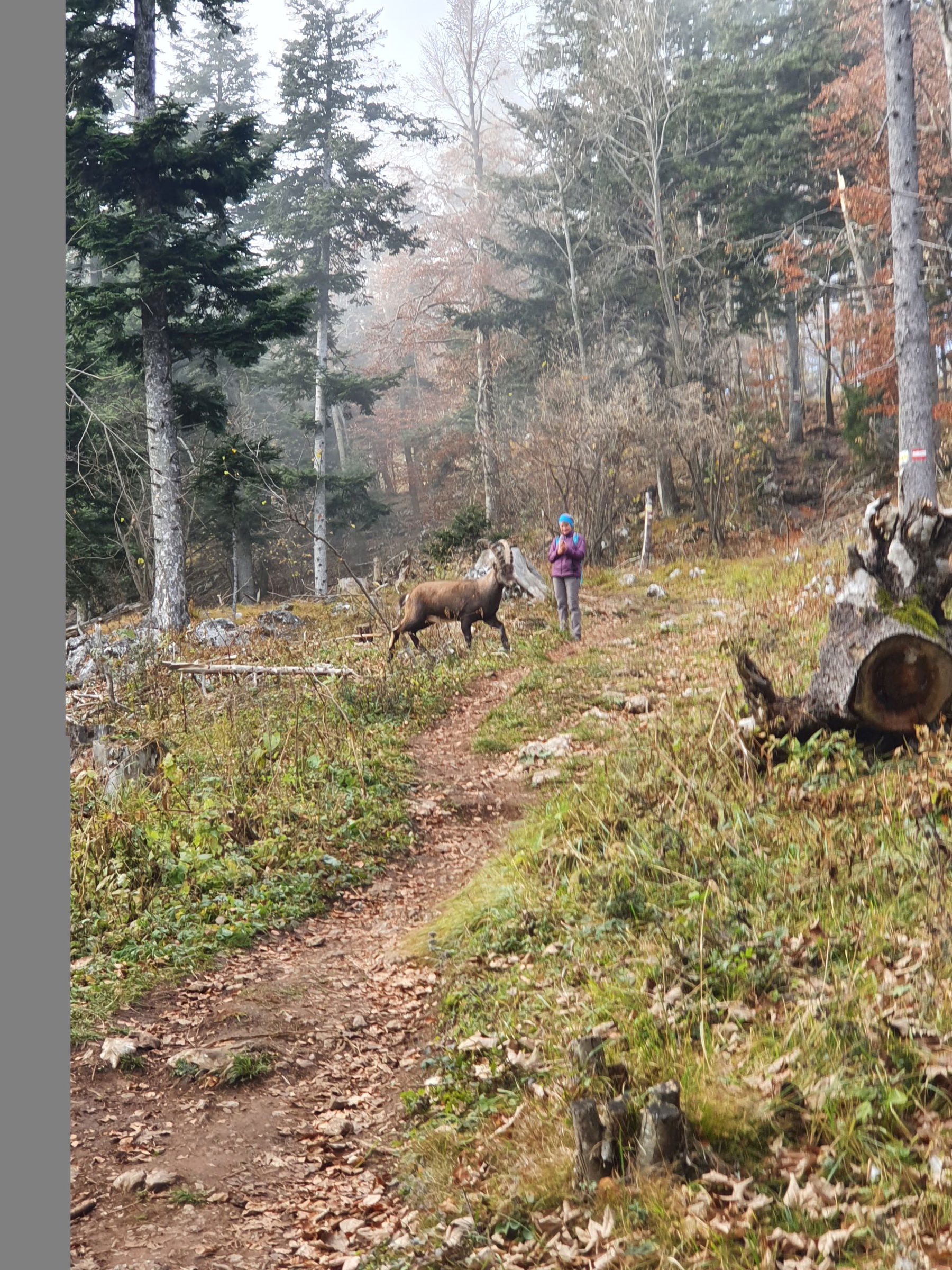 Wir wandern entlang der Felsen nach Osten, durch eine Landschaft wie aus einem Gauermann Bild, romantisch, felsig, herbstlich bunt, aber noch immer neblig. Nach etwa einer Stunde zeigt ein Wegweiser den Springlessteig an.