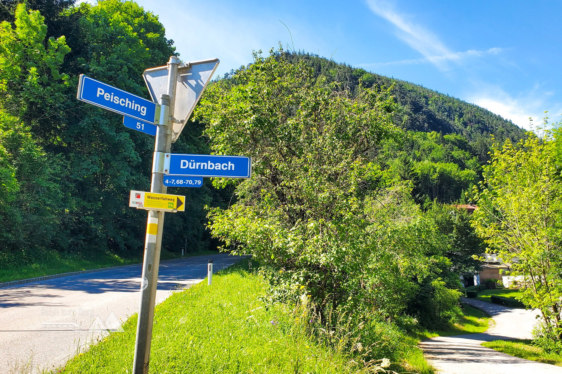 Auf dieser Straße halte ich mich für über 1,5 Kilometer. Leider ist dieser erste Teil entlang einer asphaltierten Straße, allerdings ist die Straße sehr wenig befahren (ich bin 2 Autos begegnet) somit war es eigentlich kein Problem. Nach den etwa 1,5 Kilometern erreiche ich „Dürnbach“ und sehe bald ein Schild mit der Aufschrift „Wasserfallweg“. Foto: Linda Prähauser