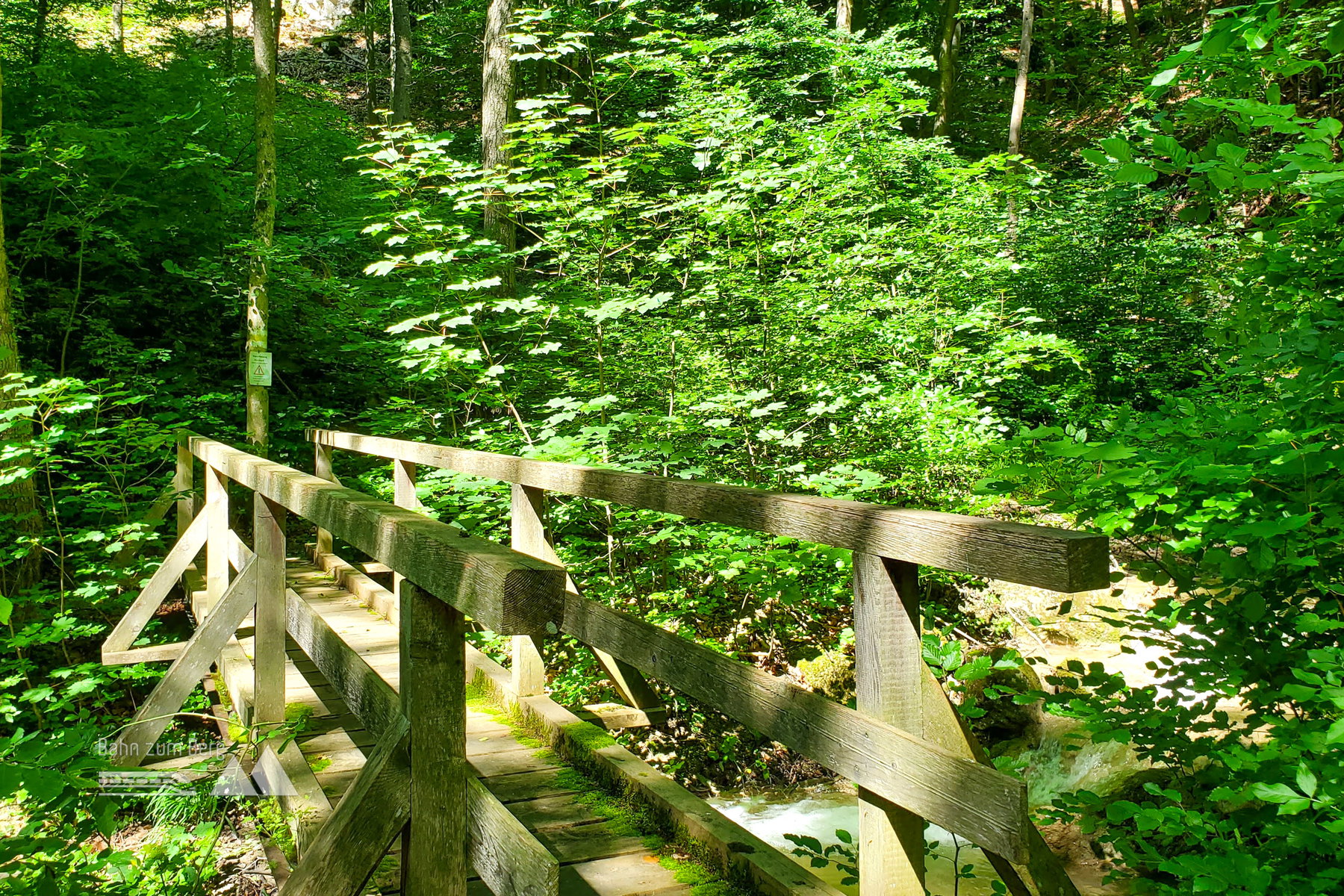 Hier verlasse ich die Straße nach rechts und folge den Schildern. Der Weg zum Wasserfall ist etwas versteckt zwischen zwei Häusern. Sobald man ihm gefunden hat, geht es in den Wald hinein entlang des Baches. Der Wasserfall ist jedenfalls jeden Besuch wert! Beim Wasserfall lege ich eine kurze Pause ein und genieße das rauschende Wasser und die Stimme.