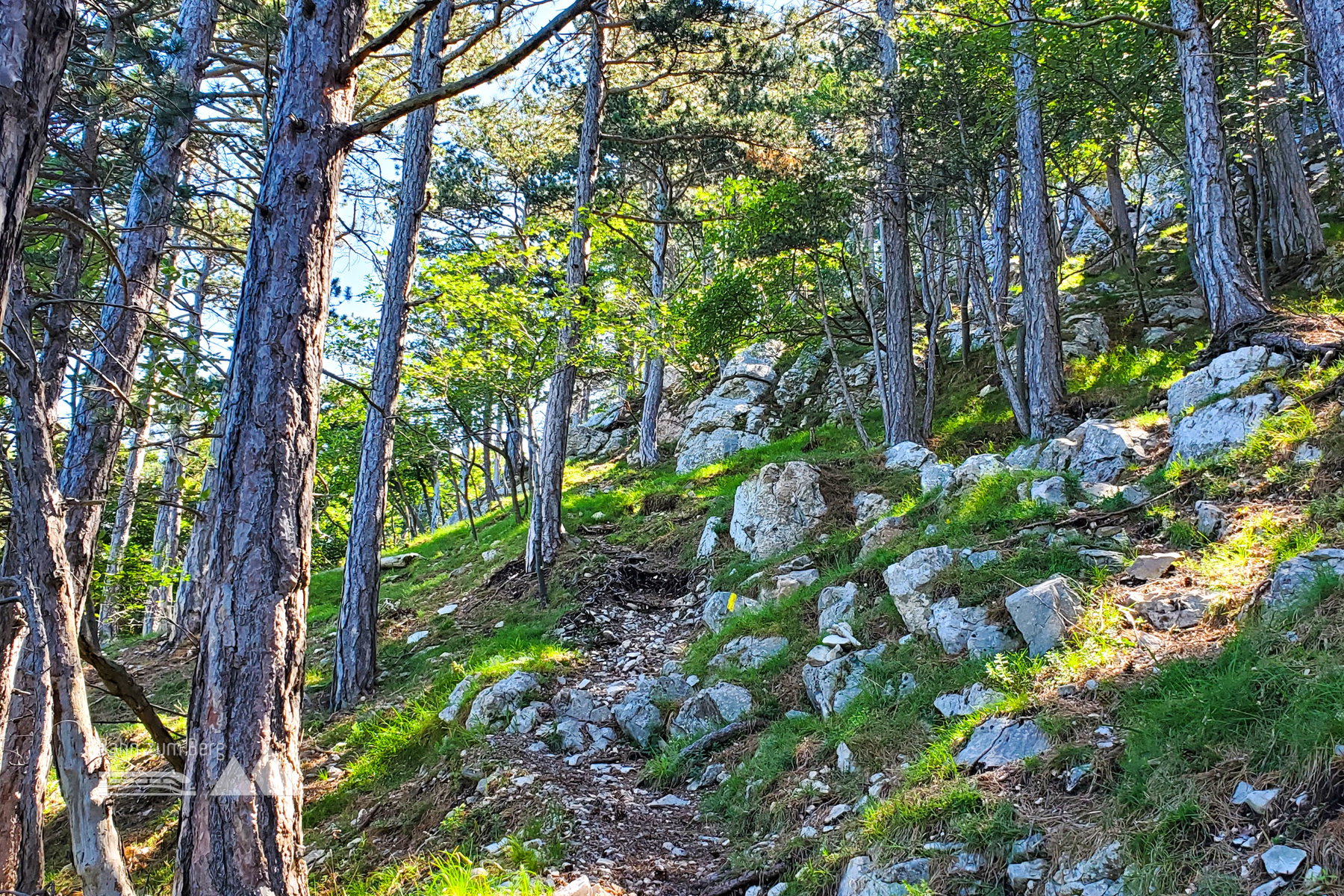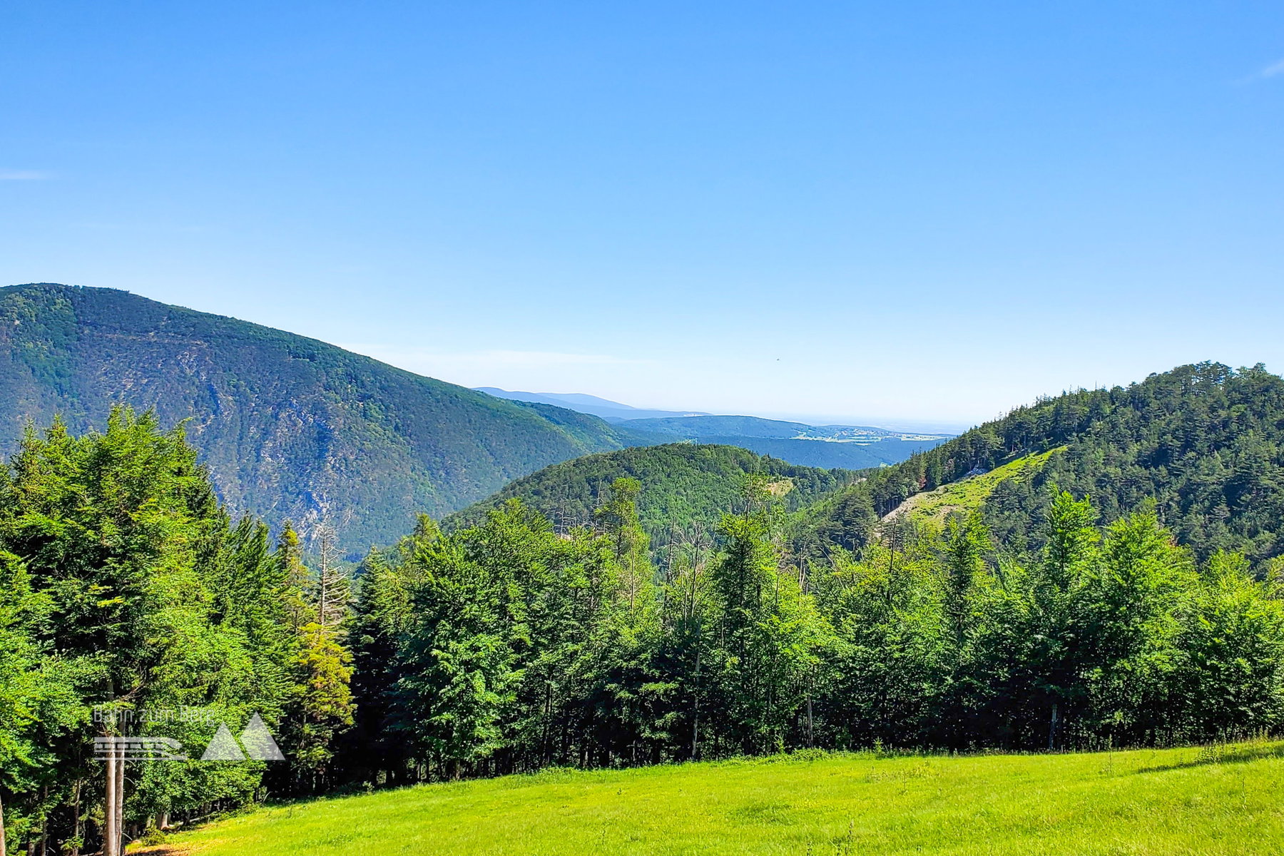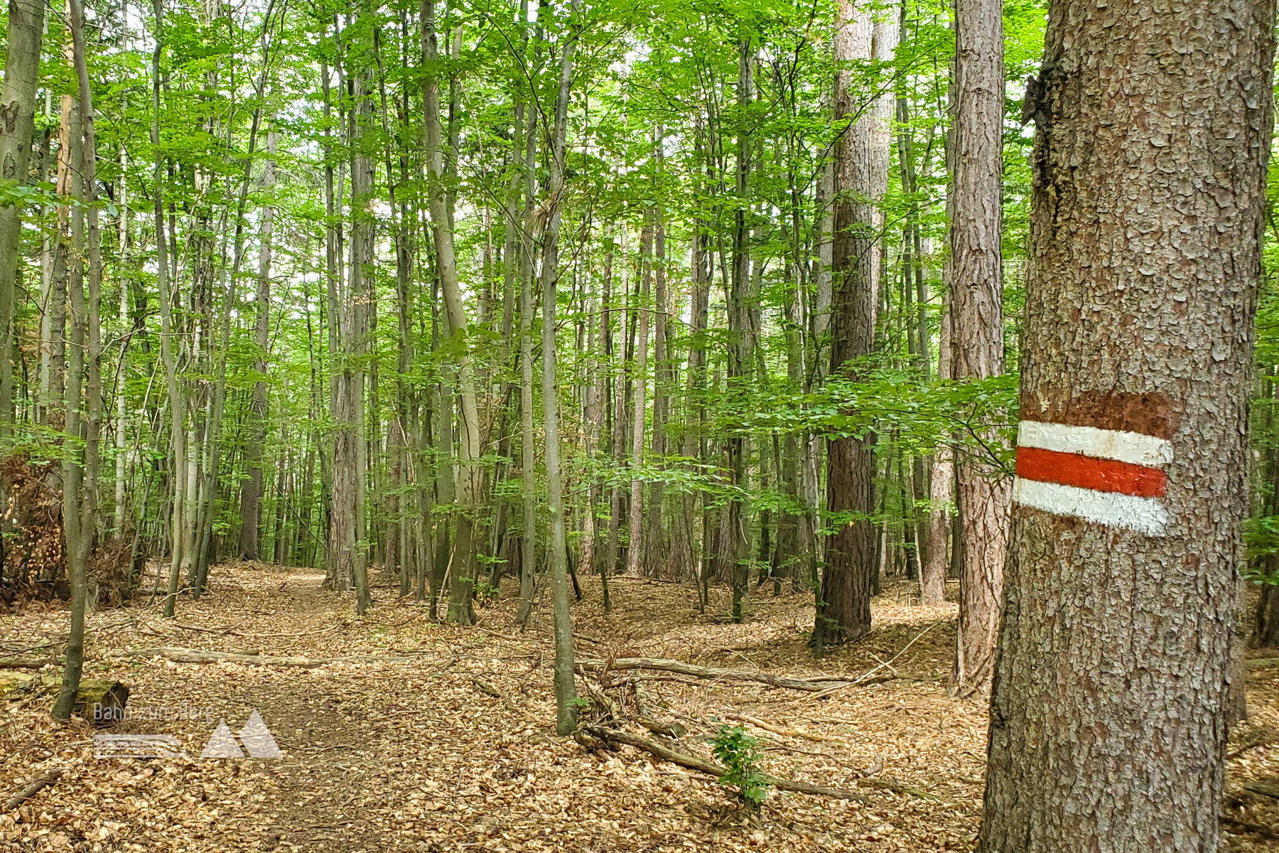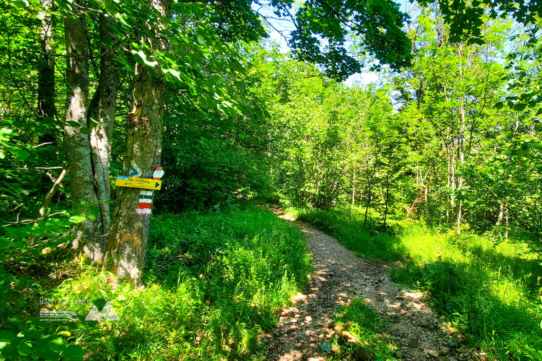 Ab hier geht es steil hinauf auf die Hohe Wand dem Stangelsteinweg entlang (immer der gelben Markierung folgen). Es geht teils steil hinauf inklusive Ausblick auf einer Lichtung. Ich kreuze eine Forststraße und gehe wieder in den Wald hinein.
