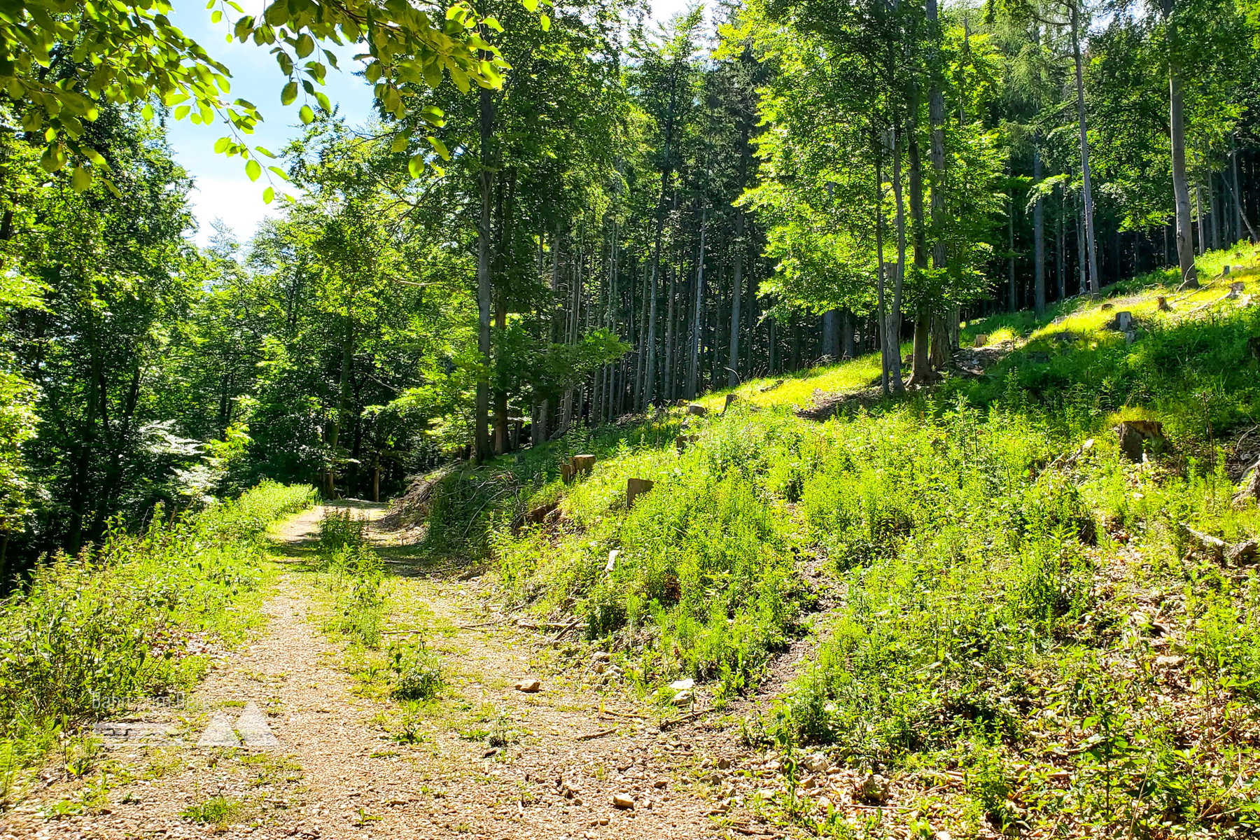 Nach weiteren 850 Metern durch wunderschönen ruhigen Wald (erst hier bin ich den ersten Wanderern auf der Route begegnet) komme ich wieder auf eine asphaltierte Straße. Dieser folge ich nach links leicht bergauf für etwa 350 Meter bis ich eine Forststraße nach links sehe. In diese biege ich hinein.
