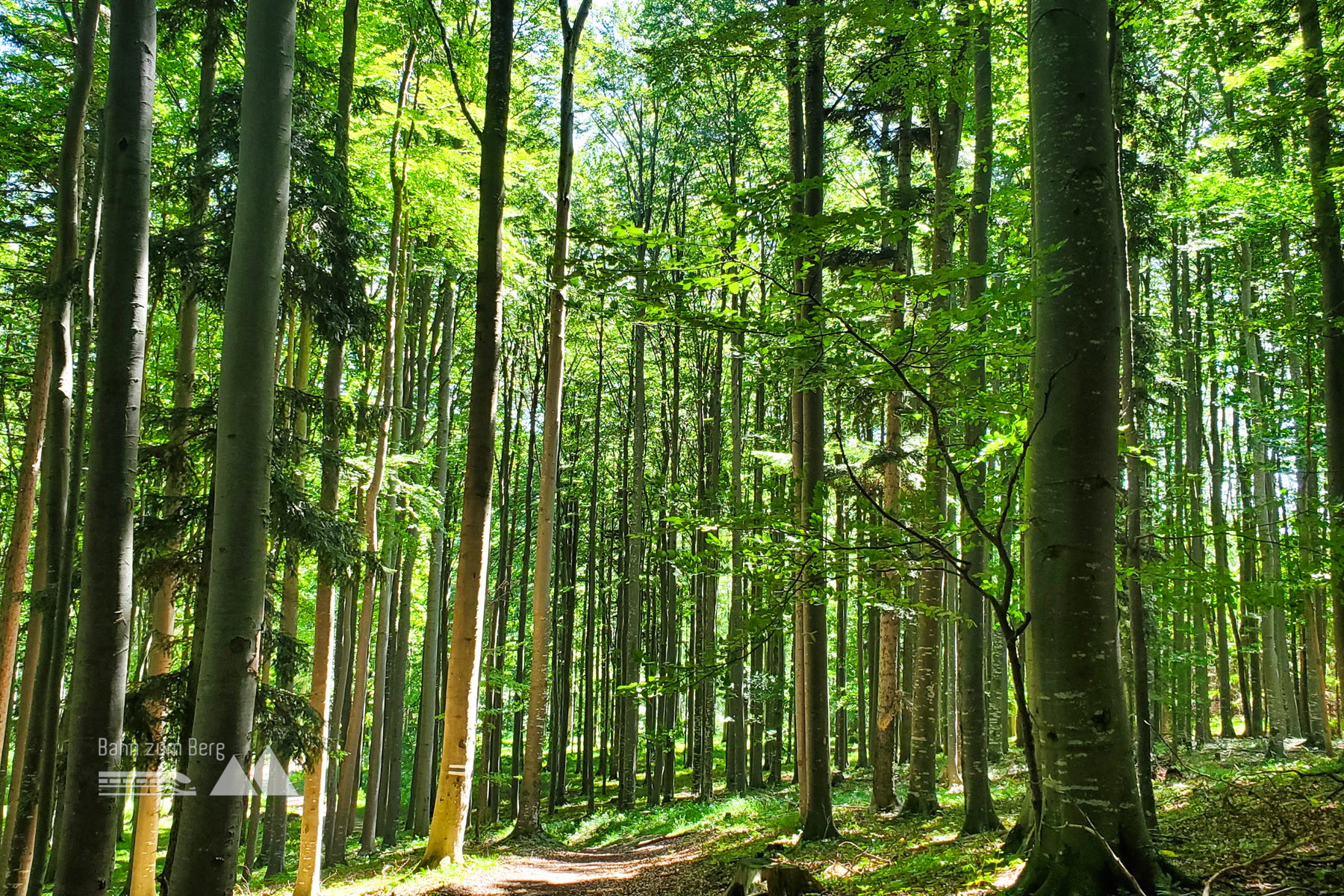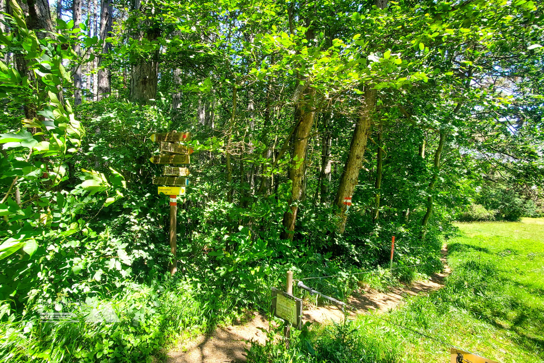 Nach etwa 300 Höhenmetern erreiche ich eine T-Kreuzung im Wald und ich biege nach links ab. Ab hier folge in der blauen Markierung. Für etwa 600 Meter geht es immer entlang des Weges hinab, bin man bei einer etwas größeren Wegkreuzung mit Info-Tafel landet. Hier geht es nach rechts weiter entlang der grünen Markierung. Nach circa 450 Metern muss man eine Forststraße kreuzen. Hier ist der Weg nicht direkt ersichtlich, aber man muss die Forststraße einfach kreuzen und wieder in den Wald hinein gehen.