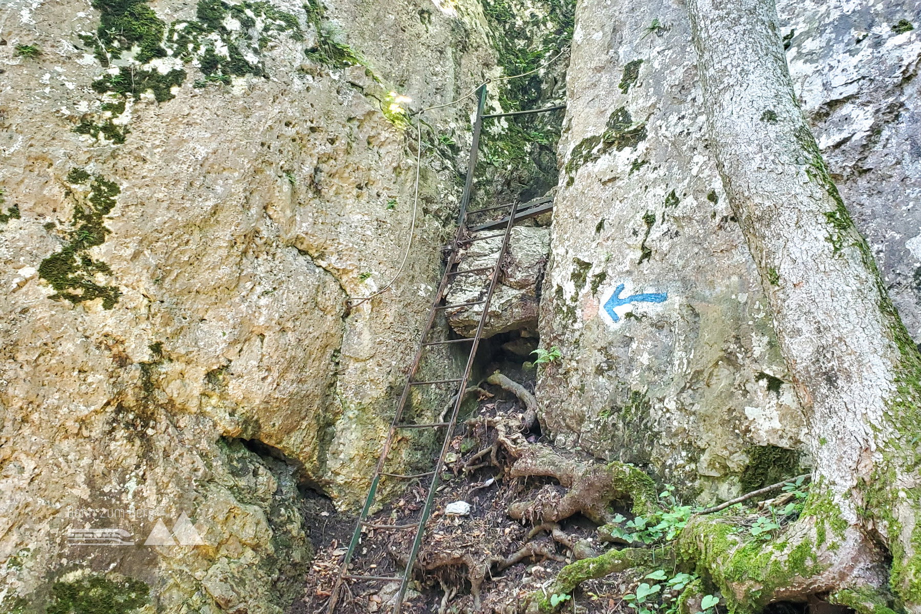 Nach den ersten Leitern komme ich an eine große Wegkreuzung, wo ich an der Parkbank links vorbei gehe und dem Weg zur Einhornhöhle folge (Blaue Markierung). Am Weg zur Einhornhöhe geht es nochmal ein paar Leitern hinunter.