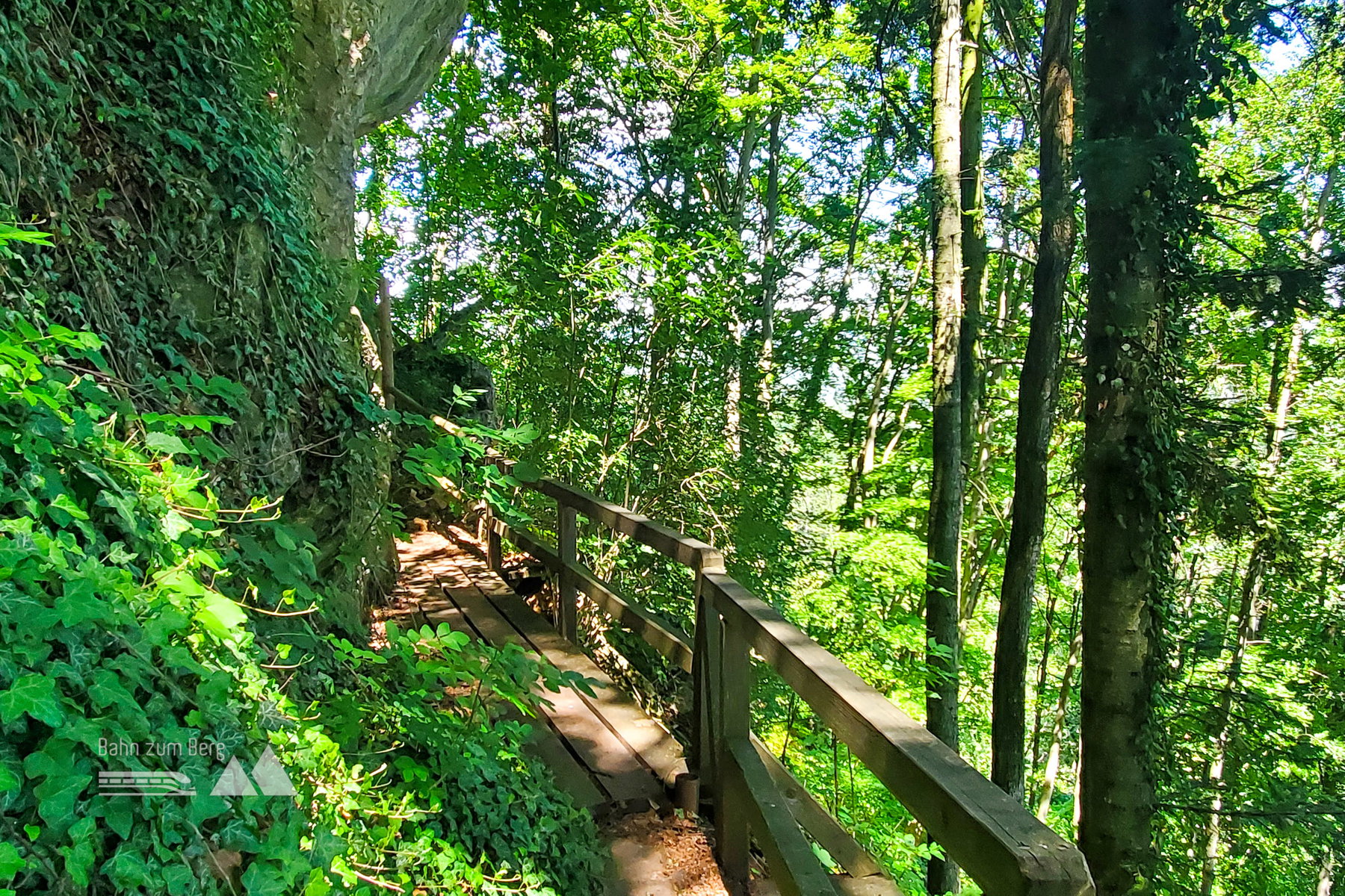 Bei der Wegkreuzung nach etwa 200 Metern halte ich mich rechts und folge der Beschilderung zum Drobilsteig. Ab hier beginnt der Abstieg über Leitern (Trittsicherheit und Schwindelfreiheit sollte man hierfür mitbringen).