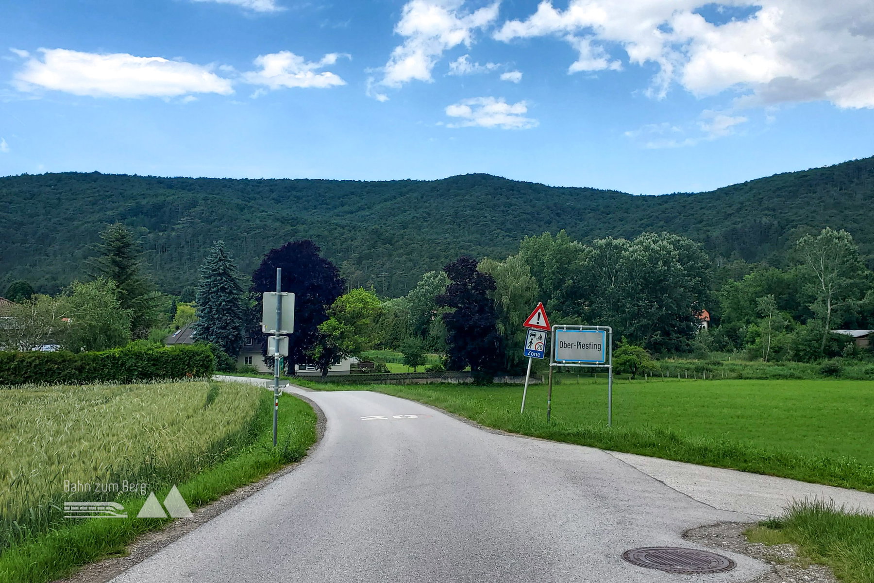 Nach etwa einem Kilometer im Wald bin ich an der Bundesstraße angekommen. Diese überquere ich und folge der Straße durch die Felder nach Ober-Piesting. Mein Ziel – der Bahnhof „Ober-Piesting“ ist nicht zu verfehlen und befindet direkt links an der Straße.