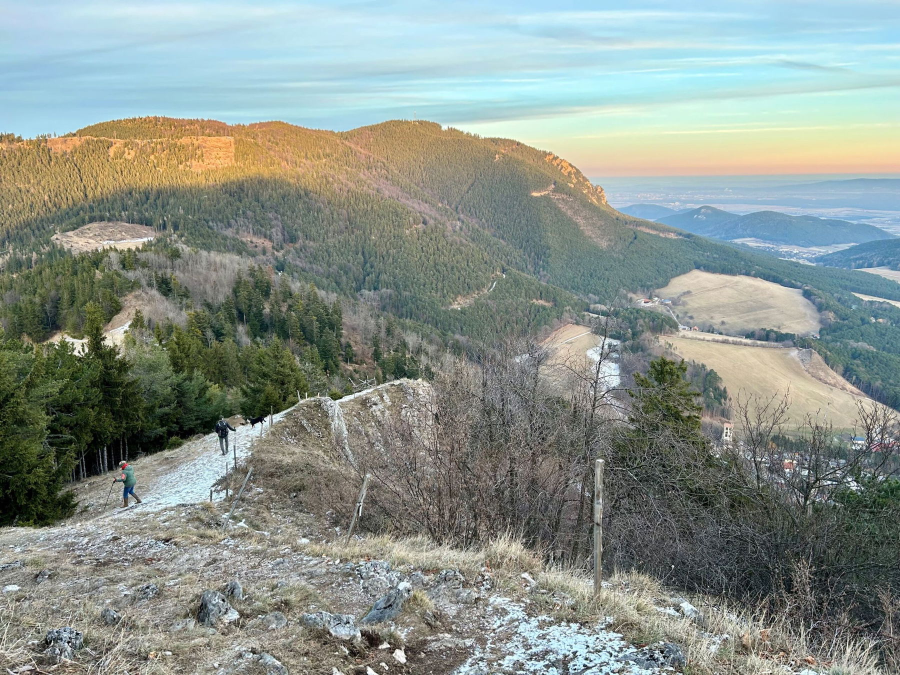 Vorbei am felsigen Hausstein auf einem schmalen, etwas rutschigen Steig auf die Gipfelwiese des Geländs. Die Strahlen der Nachmittagssonne im Rücken haste ich die letzten Höhenmeter hinauf um den Sonnenuntergang rechtzeitig und in Ruhe genießen zu können. Trotz Kälte bin ich nicht die einzige hier oben und unter allgemeinen „Ahs und Ohs“ zeigt die Wintersonne was sie kann und taucht die Welt ringsum in ein zartes Orange.