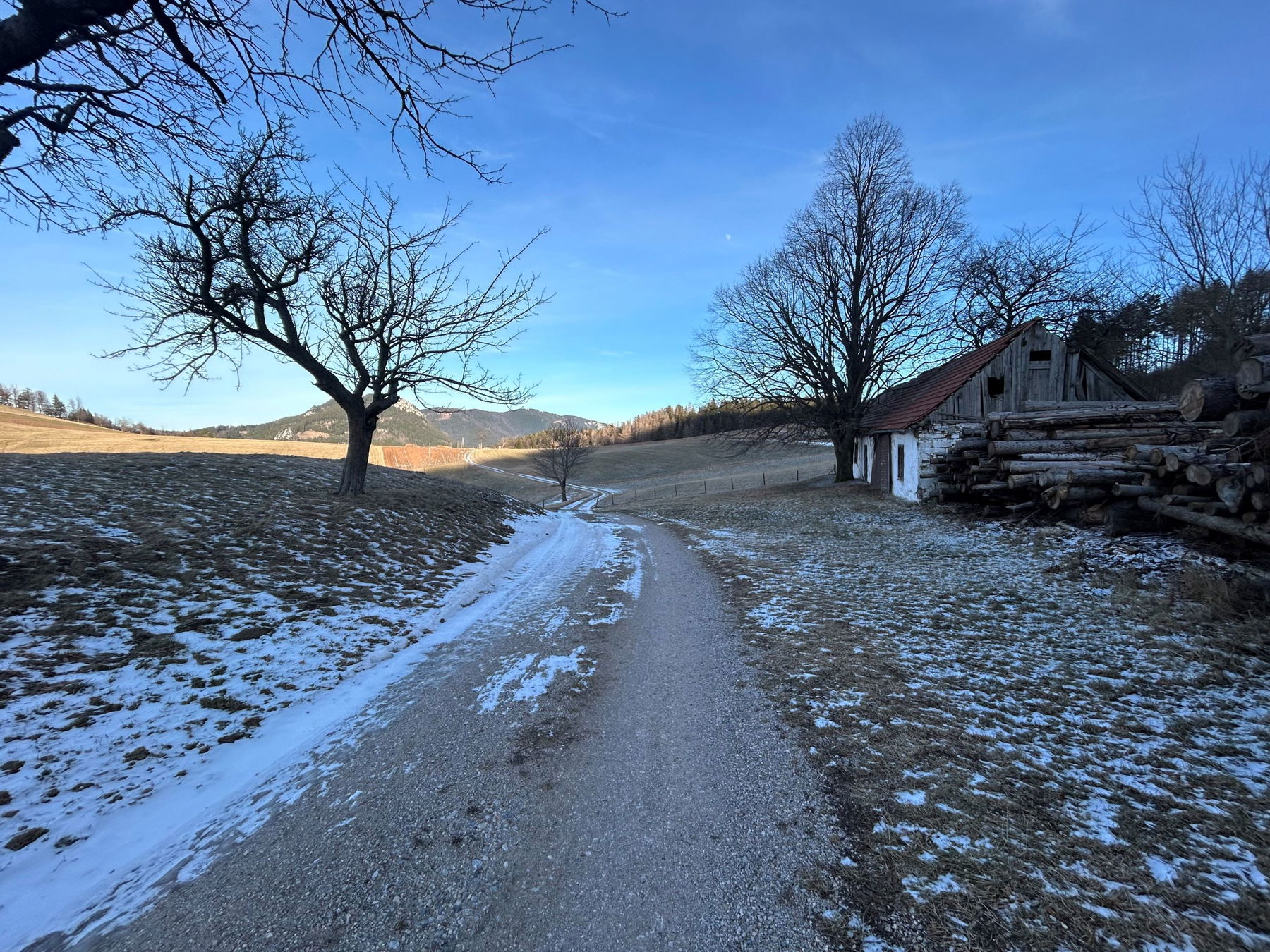 P.S. Auf der Wanderung gibt es keine Einkehr – Jause und Tee mitnehmen – Stirnlampe und Grödl sicherheitshalber auch. 🙂 Die Geländehütte ist im Winter geschlossen. Ich bin um halb Eins in Puchberg losgegangen und war – flott unterwegs – Viertel nach Vier am Geländ. Sonnenuntergang Ende Jänner um halb Fünf.