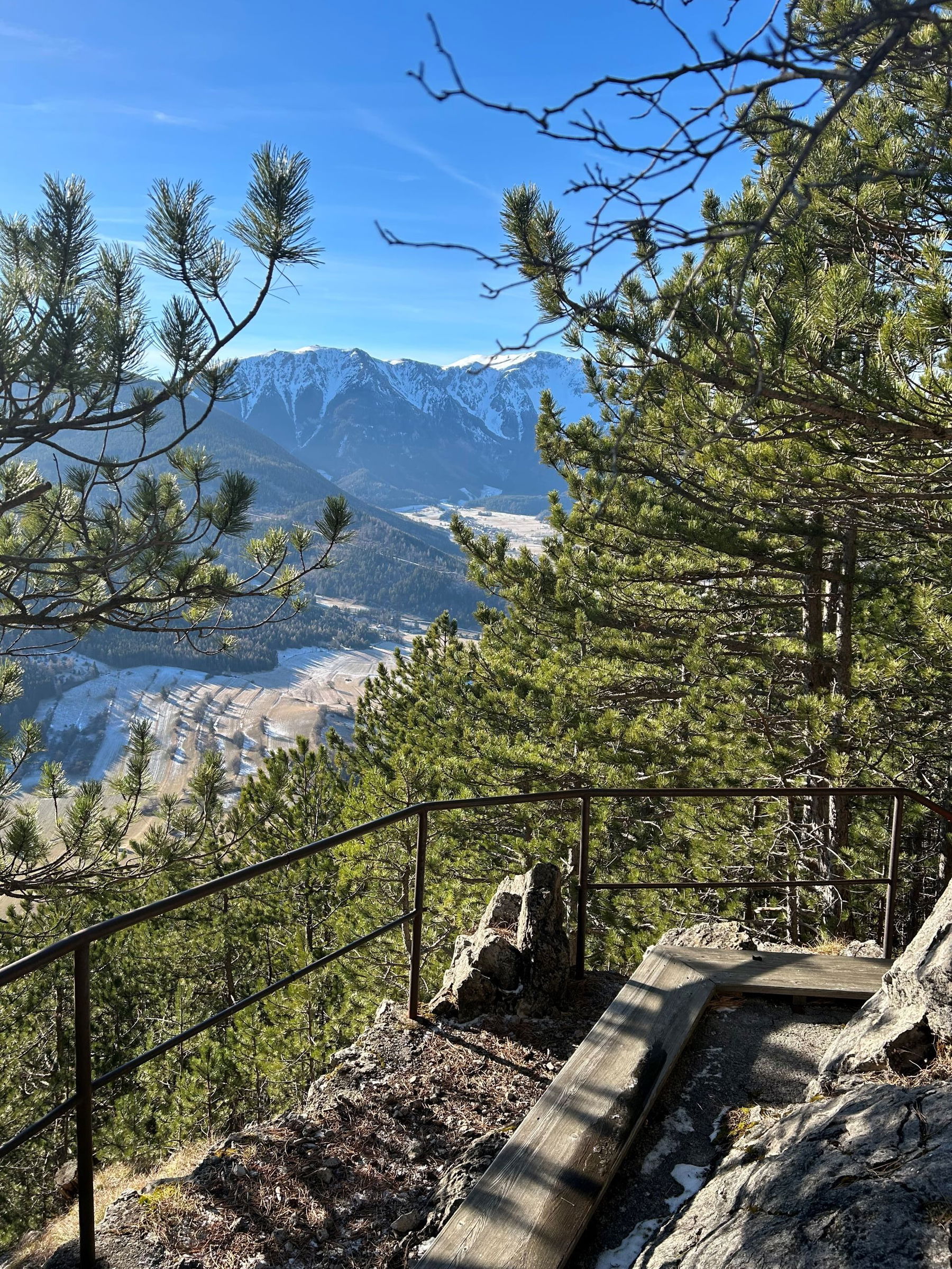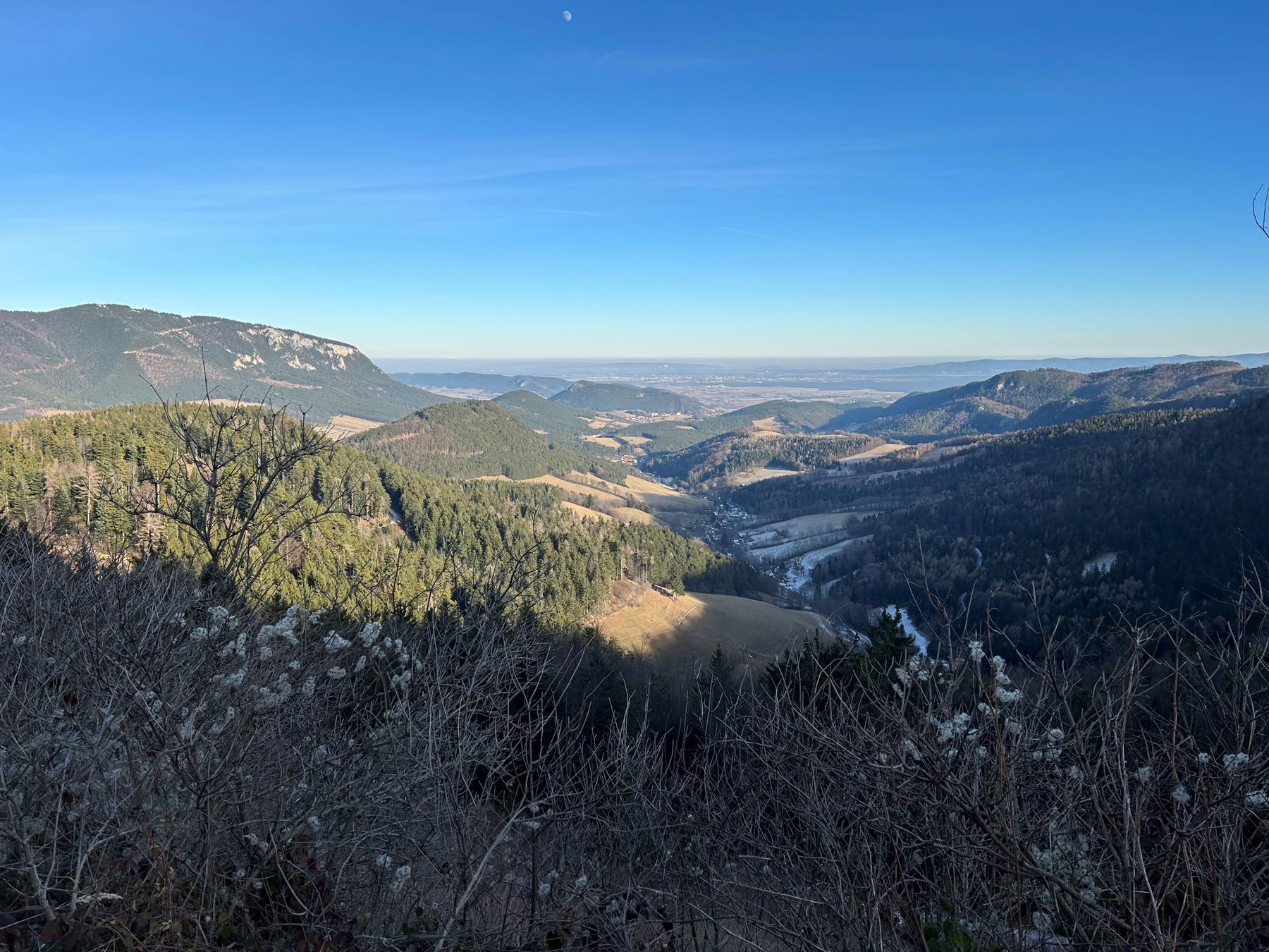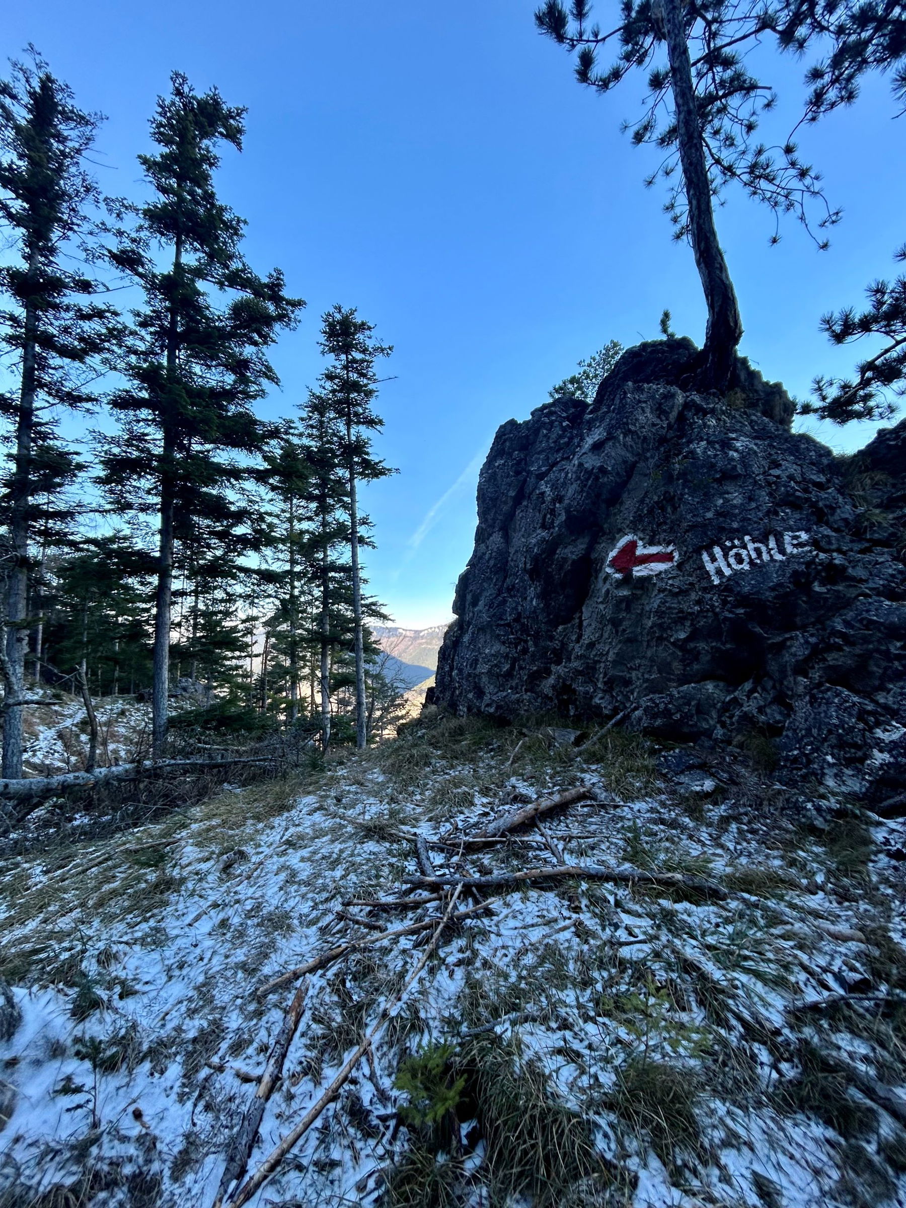 Diese Wanderung habe ich schon einmal im Frühling gemacht, jetzt im Winter wandle ich die Strecke ein wenig ab – ich will diesmal zur Allelujahöhle und auf den Kienberg. Und ich gehe erst zu Mittag in Puchberg los um zur richtigen Zeit zum Sonnenuntergang am Geländ zu sein. Dort oben ist die Aussicht einfach herrlich, vor allem zum Schneeberg im Westen, perfekt um den Lauf der Sonne zu beobachten. Durch den recht kurzen Abstieg ist man bei Einbruch der Dunkelheit schon am Weg zum Bahnhof Grünbach Schulen.