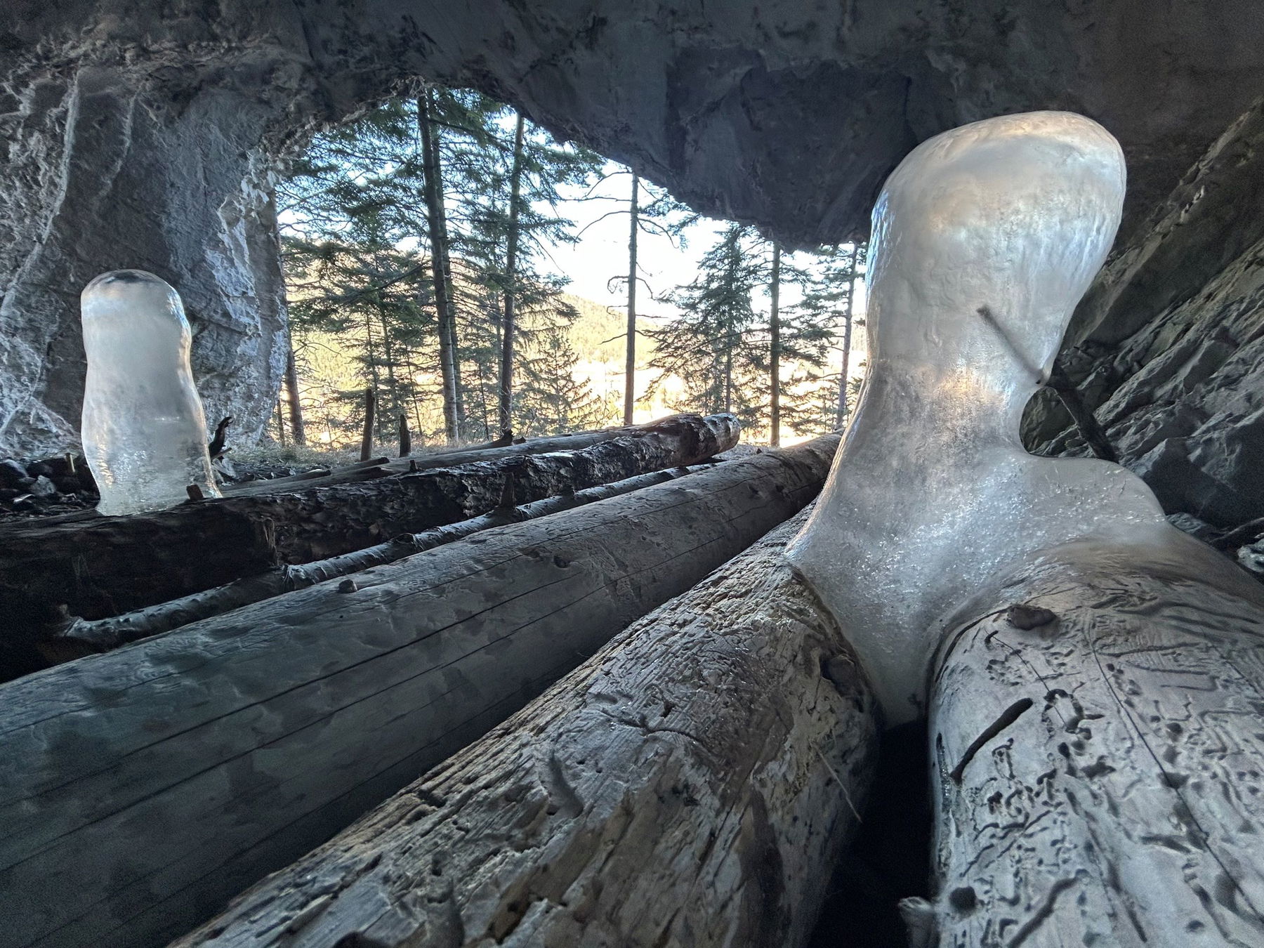 In der Höhle selber erwartet mich die erste Überraschung dieser Tour, ein richtiges kleines Naturwunder. Die Höhle liegt auf der Nordseite des Himbergs und dort ist es entsprechend kälter. Das von der Höhlendecke herabtropfende Wasser bildet Stalagmiten aus Eis.