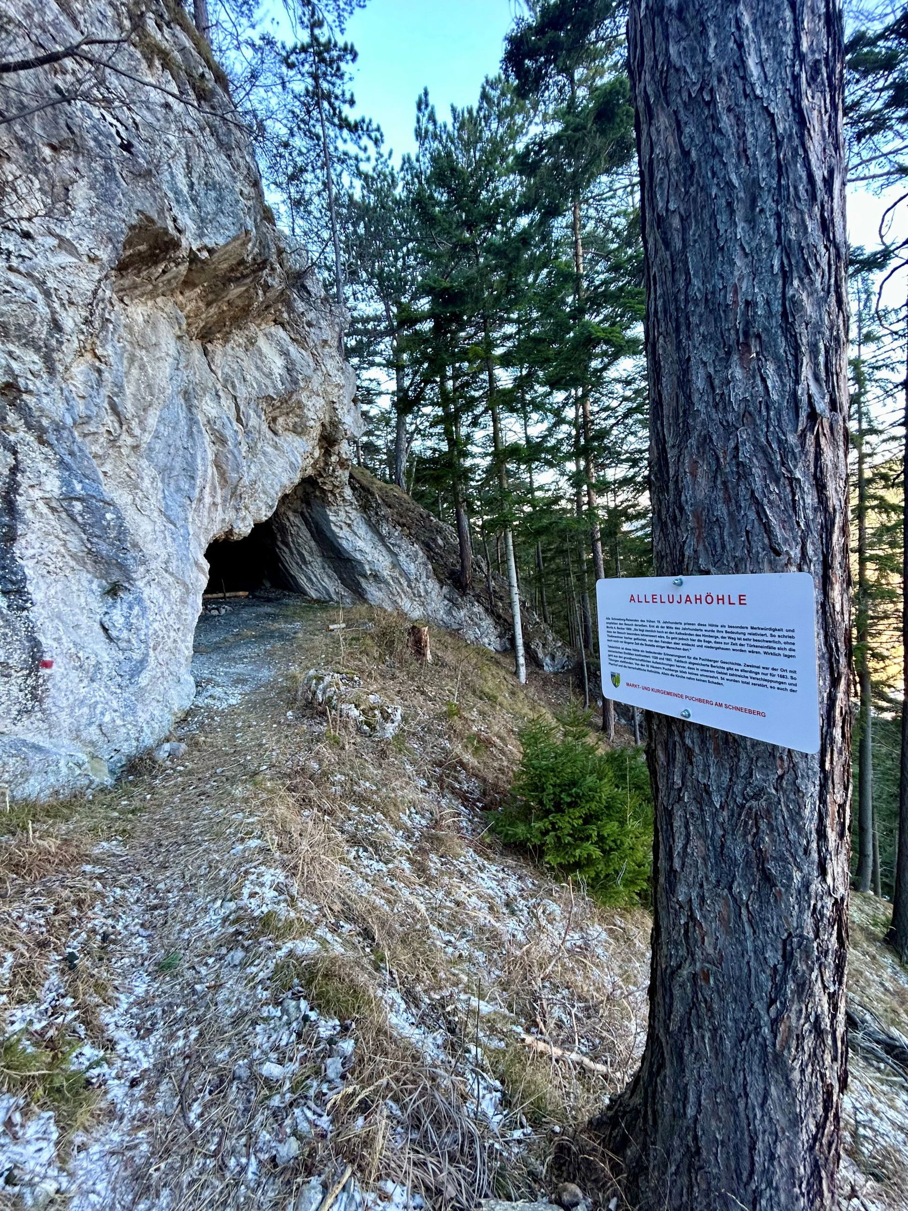 Vom Pfad auf den Himberg zweigt ein kurzer Stichweg zur Höhle ab. Auf einer Tafel kann man lesen, wie die Höhle den Puchbergern im 16. Jahrhundert Schutz vor den Osmanen bot.
