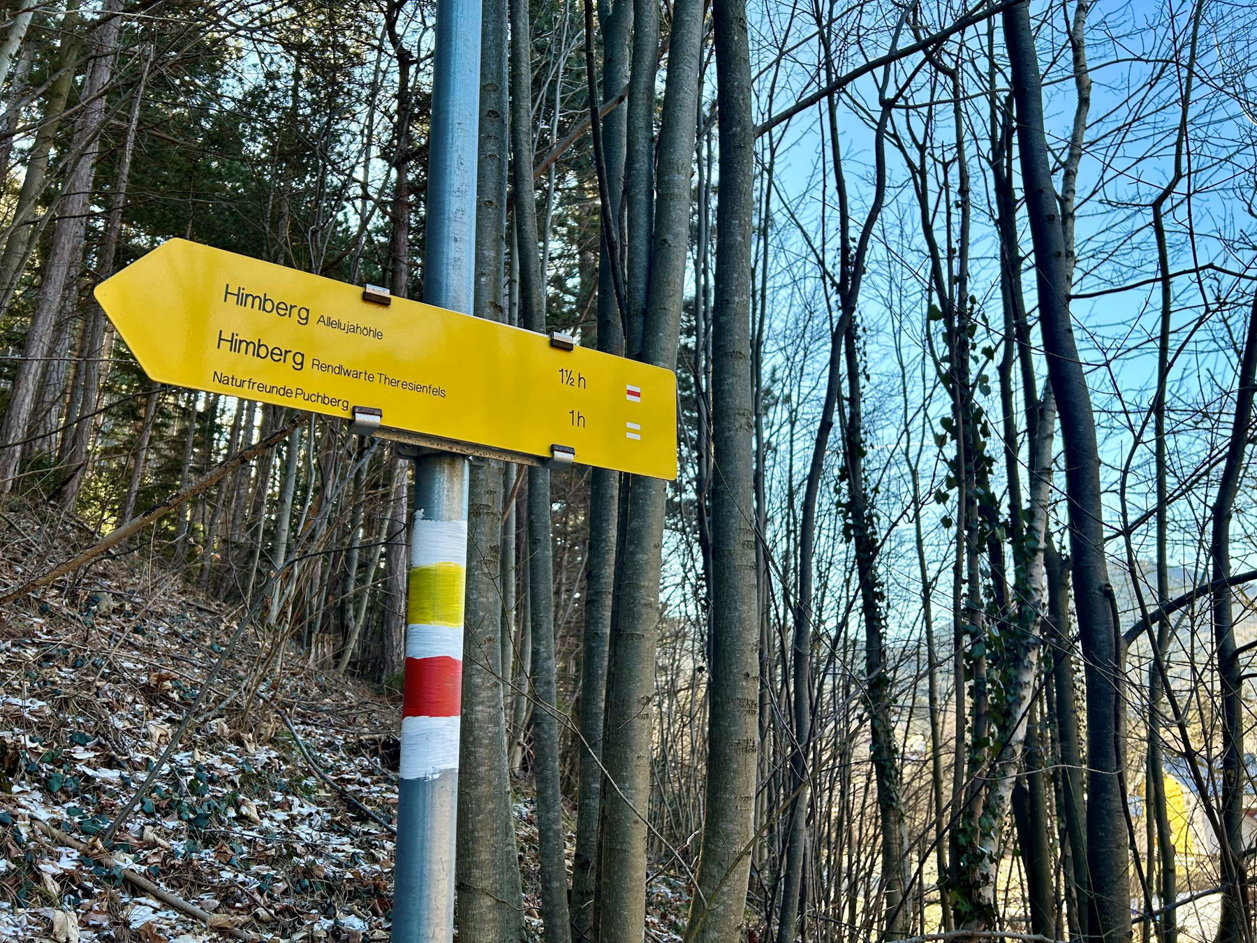 Den Bahnhof Puchberg verlassend, überquere ich den Parkplatz und die Sierning. Ein kleines Stück auf der B26 weiter. Kurz nach dem Romaykogel biege ich nach links Richtung Himberg ab. Ich wähle den rot markierten Weg zur Allelujahöhle.