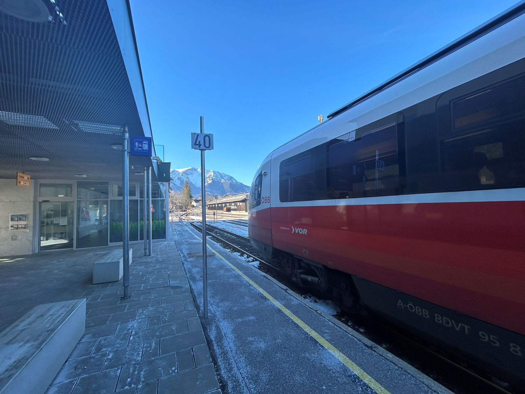 Die Wege vom Geländ nach Grünbach sind alle schön aber auch recht steil und rutschig (Eselsteig, Bergmannsteig). Da es bereits dunkel wird, wähle ich den einfacheren Weg über Scheimhütte und Rastkreuz. Im Ort Grünbach angelangt, wandere ich neben dem Sportplatz zur Haltestelle Grünbach Schule. Mit der schwindenden Sonne wird es recht kalt und das Warten am Bahnsteig auf den Zug nach Wiener Neustadt macht mir keinen Spaß. Deshalb nehme ich – Klimaticket sei Dank – den früheren Zug nach Puchberg und bleibe sitzen bis er dann retour fährt und in Wiener Neustadt ankommt.