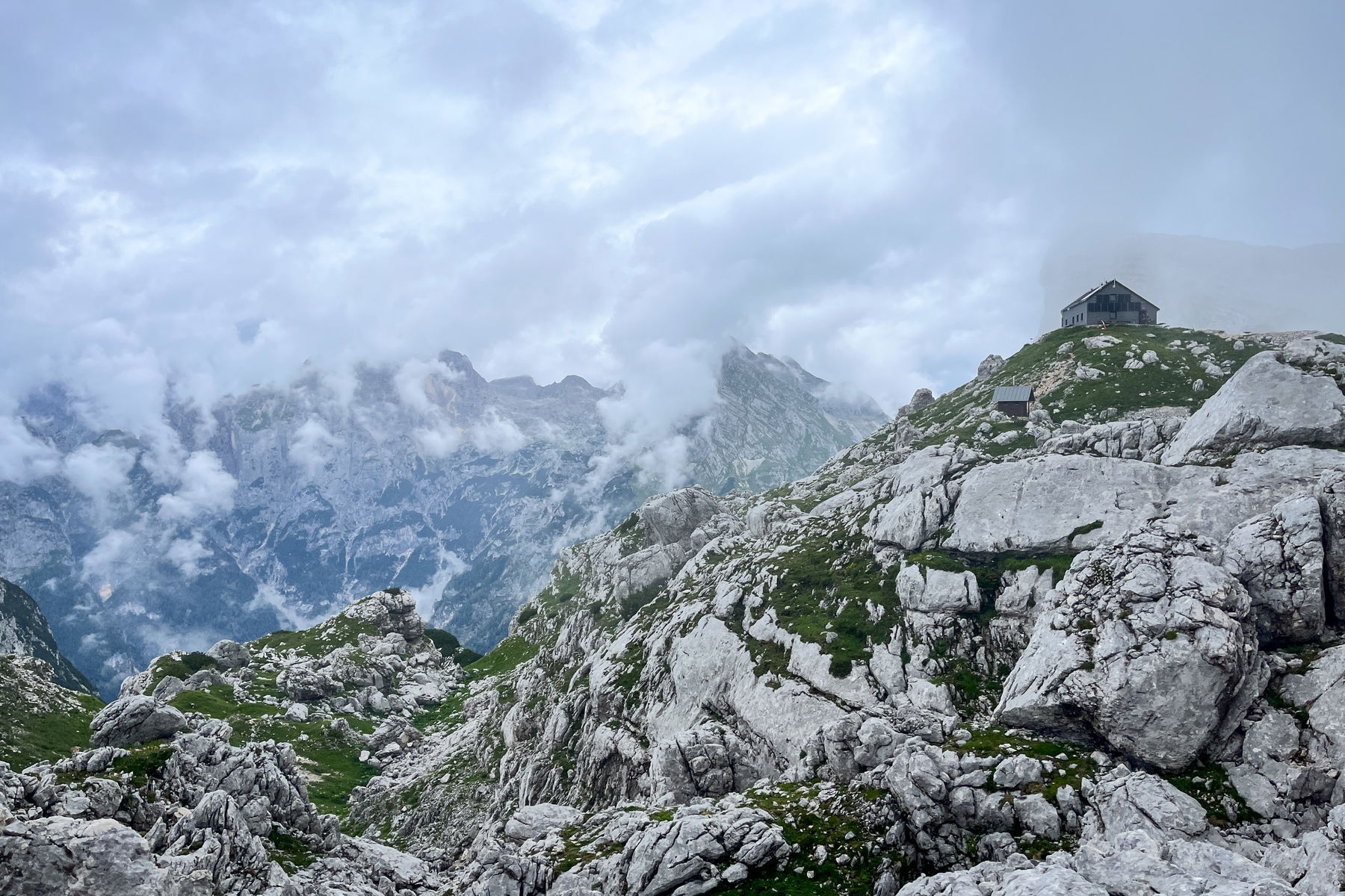 Von der Hütte könnte man nun auf den Triglav aufsteigen. Da der Triglav viel bestiegen wird, kommt es immer wieder zu Steinschlägen. Daher braucht man unbedingt einen Helm und idealerweise ein Klettersteigset für die letzten versicherten Meter. Wir hingegen haben uns, hauptsächlich weil wir keinen Helm und kein Klettersteigset den restlichen Urlaub über mittragen wollten, gegen eine Besteigung entschieden. Da der Tag mit Regen beginnt und wir aufgrund von Nebel nur wenige Meter weit sehen, sind wir froh über diese Entscheidung. Der Vorteil des Wetters ist auch, dass wir, als wir um 9 Uhr starten, alleine den Weg Richtung Triglav gehen.