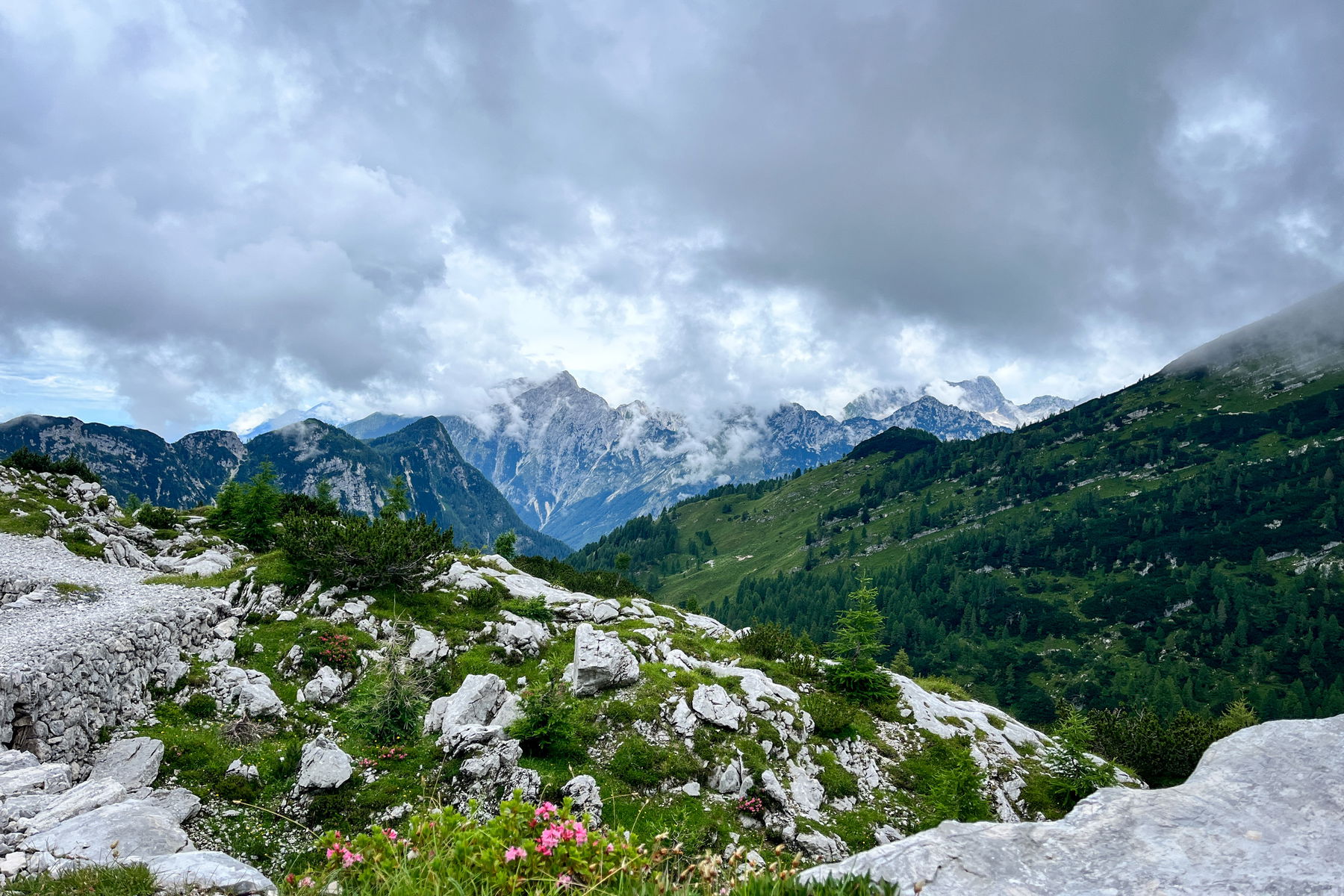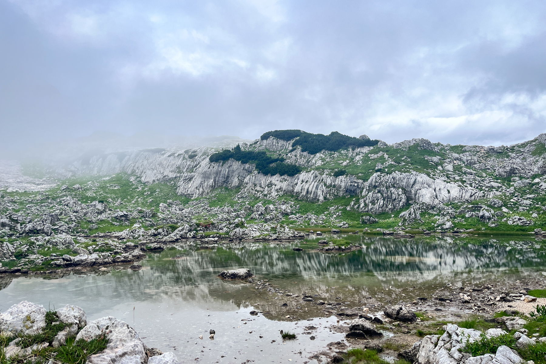 Der heutige Tag bringt ca. 15 Kilometer und 550 Höhenmeter im Aufstieg und knackige 1.650 Höhenmeter im Abstieg. Wir starten hinter der Hütte und gehen den Pfad hoch, stetig bergauf in Richtung Triglav. Der Weg ist wunderschön. Es gibt viele kleine Seen (Der Name der Gegend ist auch “Tal der Triglav Seen”) und im neblig, diesigen Wetter ist es, trotz des mangelnden Panoramas, bezaubernd und es wächst überall Schnittlauch (Ich liebe Schnittlauch!).