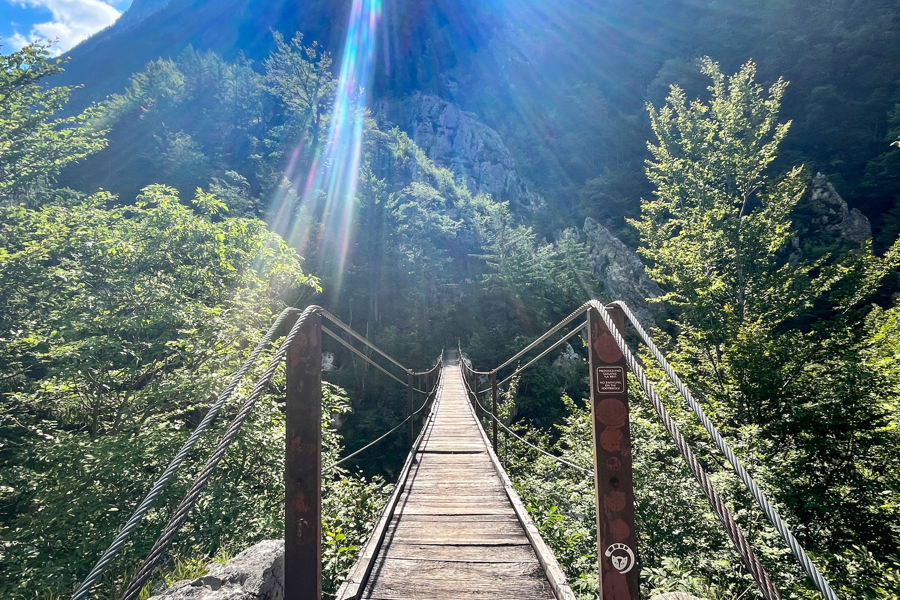 Am letzten Tag folgen wir dem Alpe Adria Trail von unserer Unterkunft nach Bovec. Der Weg ist wirklich gut ausgeschildert und man geht quasi durchgehend am Fluss entlang. Es ist wirklich wunderschön, das Wasser eiskalt erfrischend (zum Glück ist es warm und sonnig!) und der Weg entspannt mit wenig Höhenmeter. Die Etappe ist knapp 18 km lang und bringt etwas mehr als 300 Höhenmeter im Aufstieg und 500 Höhenmeter im Abstieg mit sich. Wir starten um 09:15 nach einem guten Frühstück mit Proviant im Gepäck.