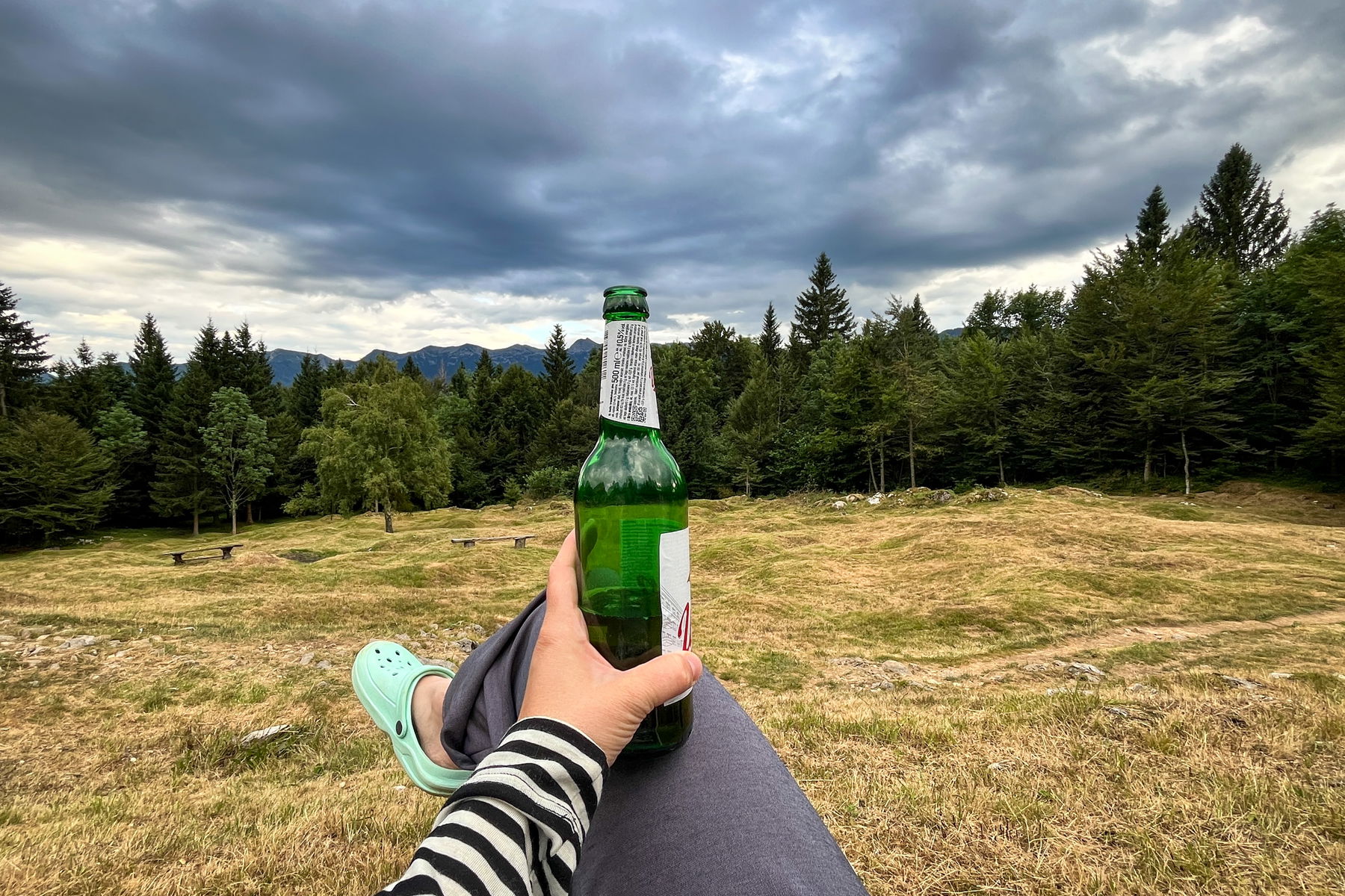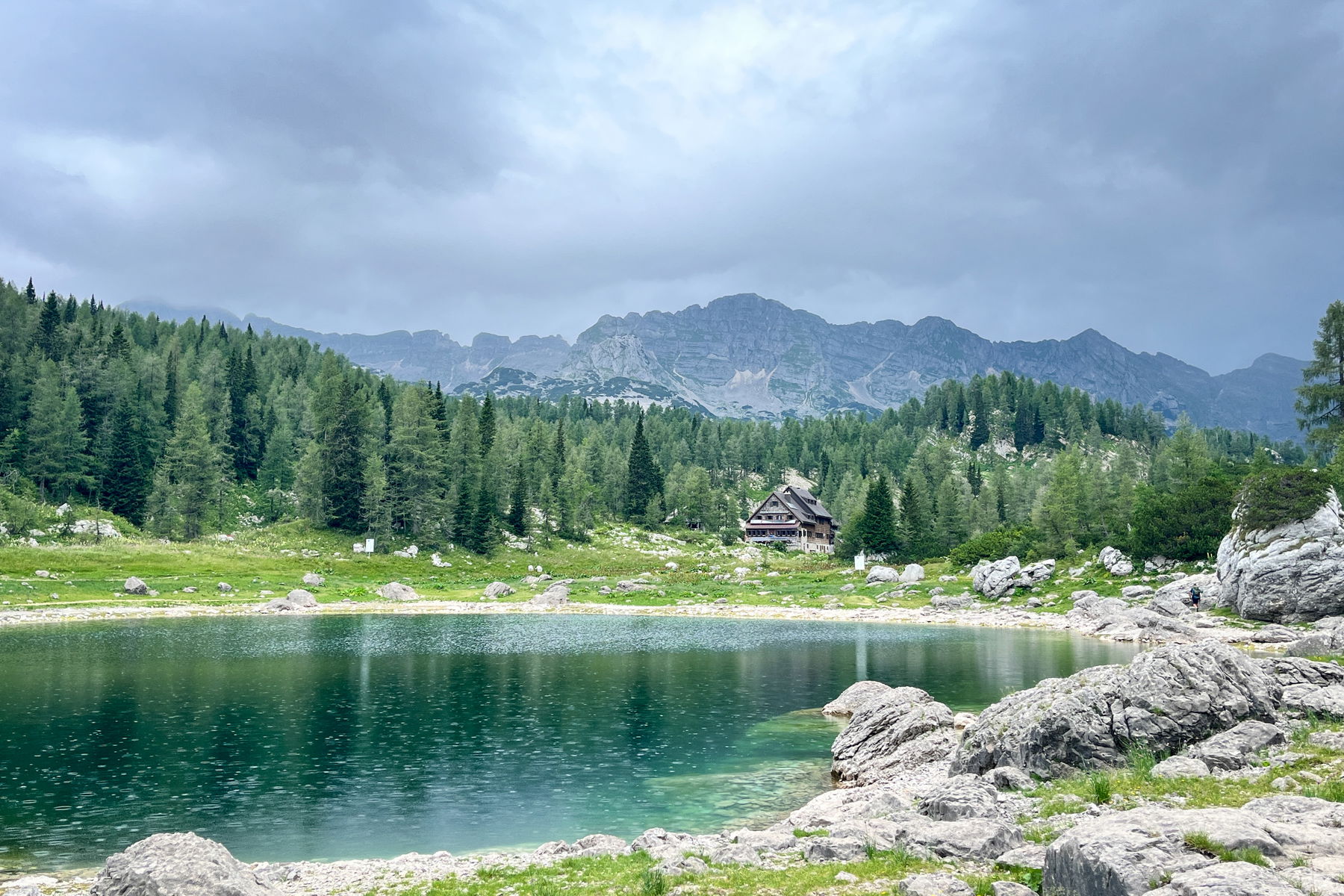 Um 13 Uhr machen wir uns dann wieder auf den Weg und gehen auf einem wunderschönen Pfad in Richtung Tagesziel, die Hütte Koča pri Triglavskih jezerih bei den Zwillingsseen. Um ca. 15 Uhr erblicken wir den ersten See und kommen rechtzeitig, bevor es richtig zu schütten beginnt, bei der Hütte an. Die Hütte ist riesig, top organisiert und das Essen ist ok. Reservierung definitiv empfohlen (Hier geht es zur Buchungsplattform). Es gibt etwas zu wenig Sitzplätze bei Schlechtwetter und zu wenige Waschgelegenheiten. Leider feiern auch einige der Bergsteiger*innen ihre Triglav-Besteigung bis spät in die Nacht und daher ist es auch recht laut.