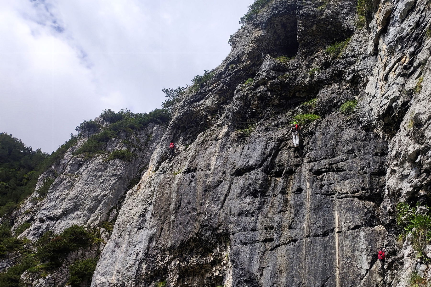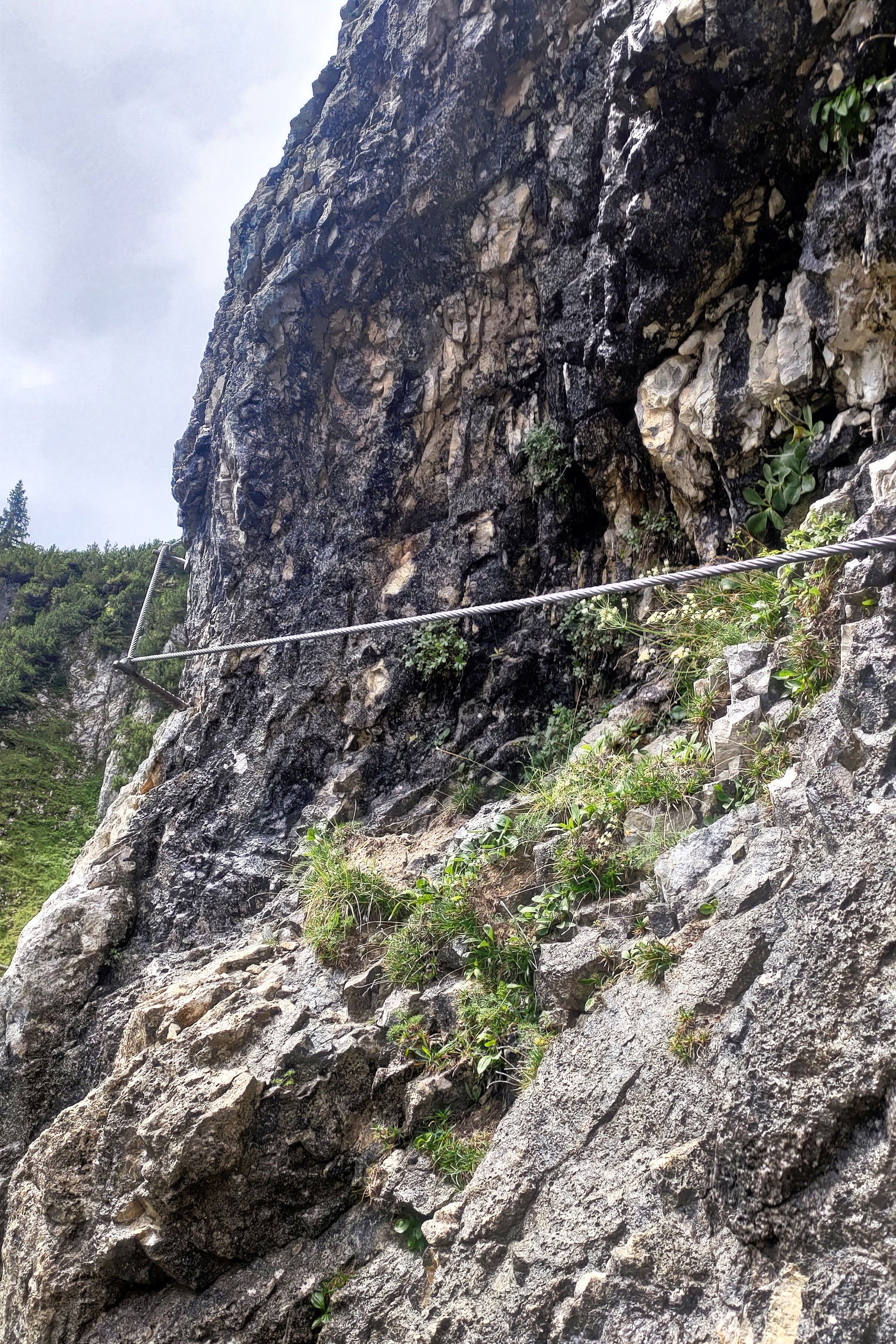 Orographisch auf der linken Bergseite beginnt der Klettersteig. Hier legen wir Klettersteigset und Helm an. Nach einer kurzen Einstiegsplatte führt der Steig auf einem Band im Schrofengelände quer durch die imposante Felswand. Dieser Teil ist nicht durchgehend versichert, Konzentration und Trittsicherheit sind gefragt. Im weiteren Verlauf erreichen wir die Jägerwand-Treppe, vermutlich das bekannteste Stück des Steiges: Einige Trittbügel in Stufenform entlang der Wand bringen uns näher zum Gipfel.