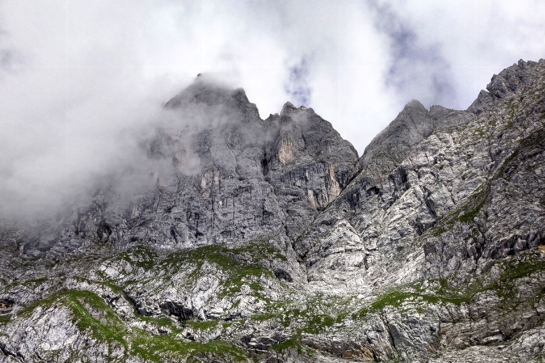 Der Ellmauer Halt, beim Zustieg noch im Nebel. Foto: Simon Widy