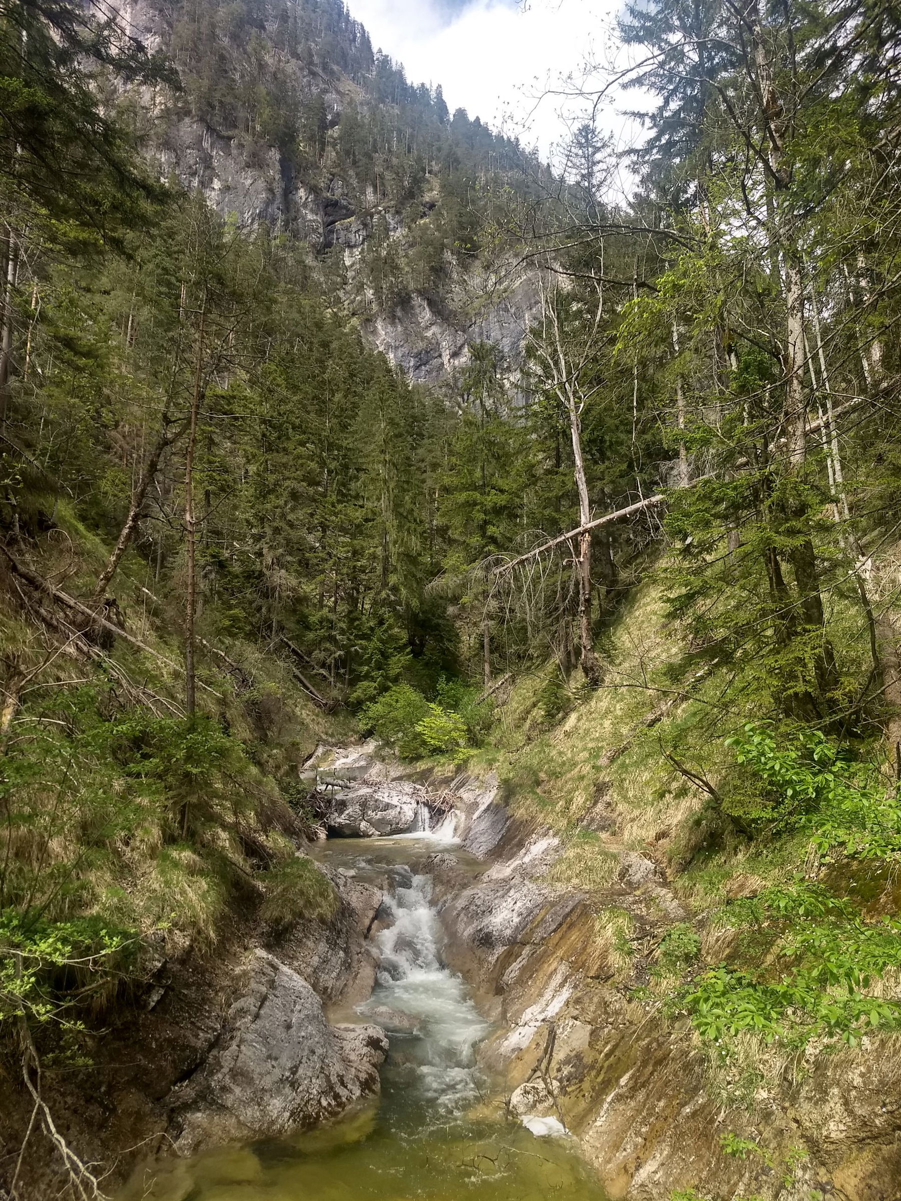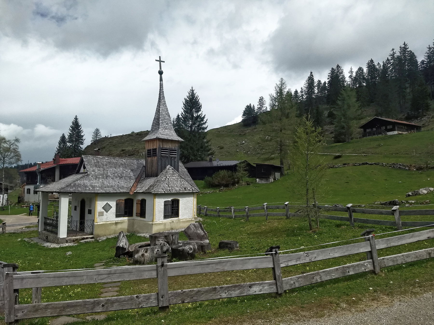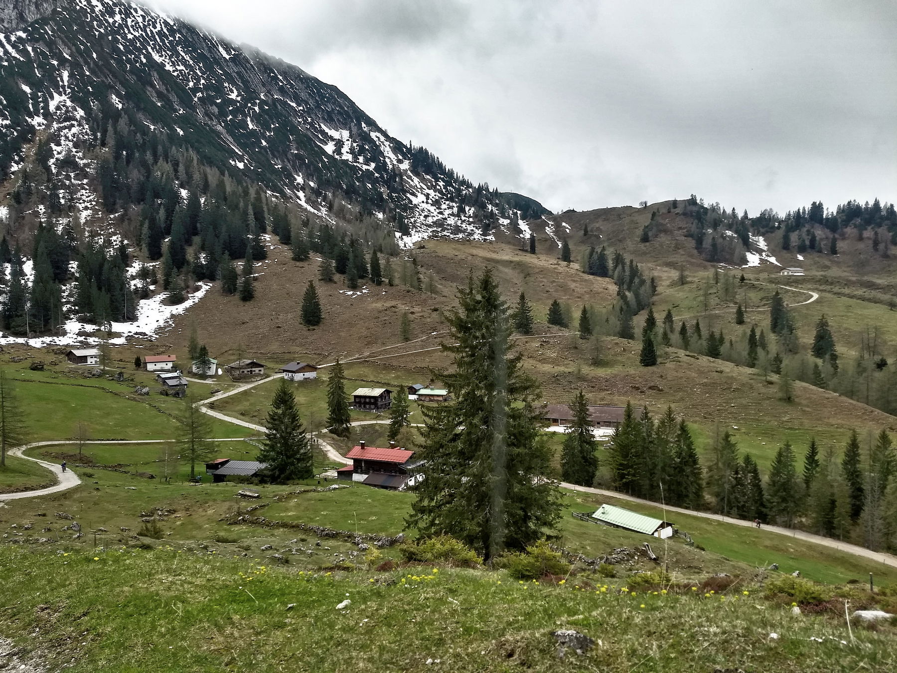 Der Abstieg gestaltet sich zunächst recht steil, bevor der Weg abflacht und scheinbar ewig auf nahezu gleicher Höhe diverse Geländeeinschnitte traversiert. Kurz vor Erreichen des idyllischen Almdorfs rund um die Kaindlhütte mündet der Bettlersteig aus dem Kaisertal ein.