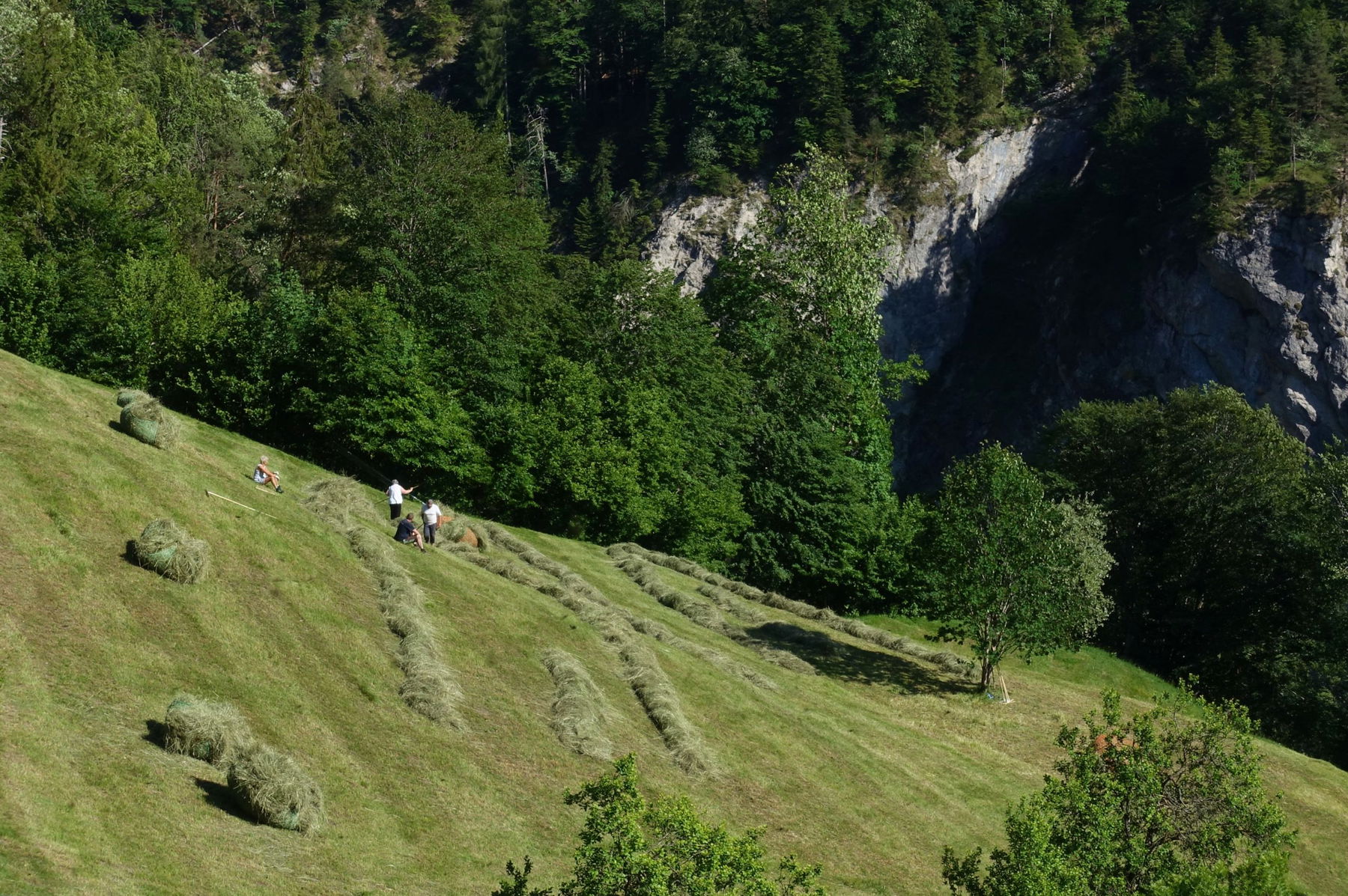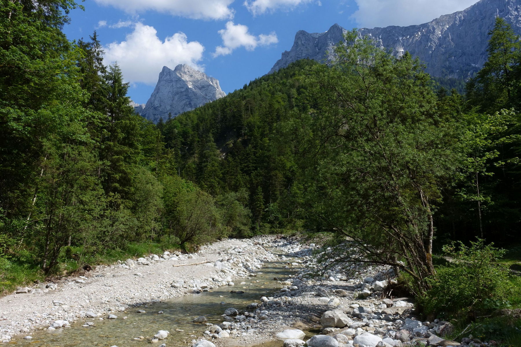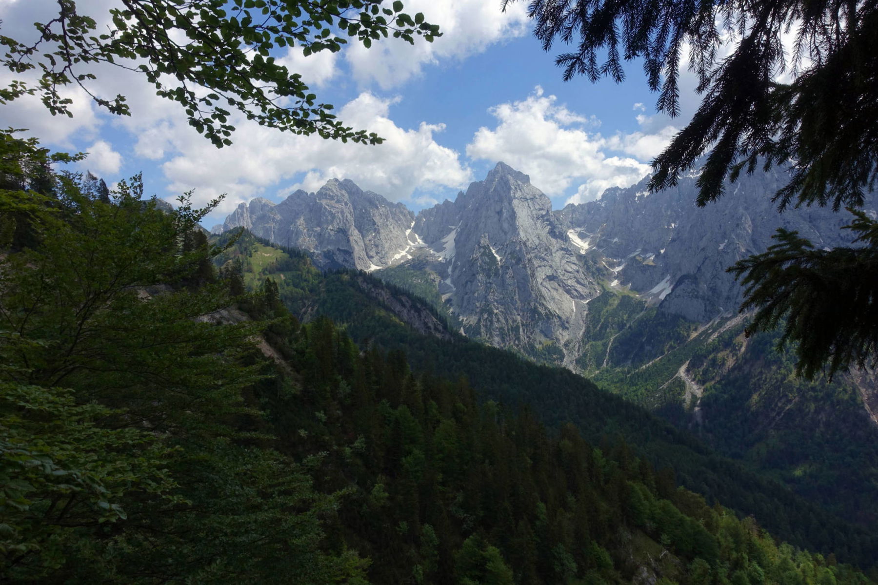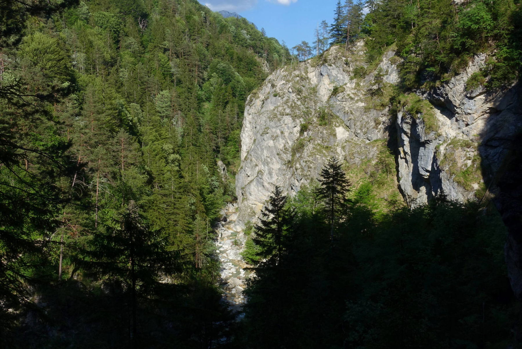 Auf einer Forststraße wandere ich durch das in diesem Abschnitt waldreiche Kaisertal weiter Richtung Kufstein. Immer wieder bieten sich – wie auch schon beim vorherigen Abstieg – schöne Ausblicke in Richtung Wilder Kaiser, aber auch Tiefblicke zum Kaiserbach.