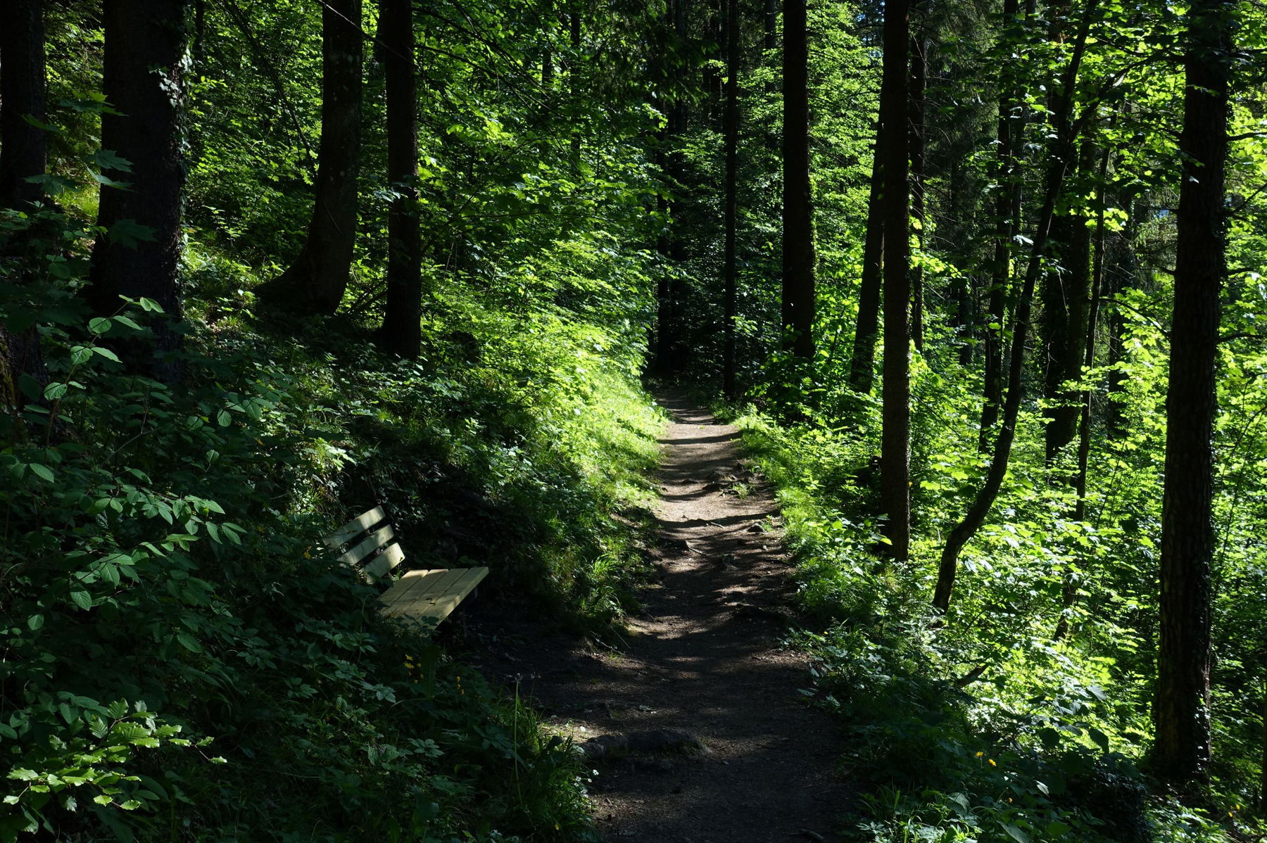 Bei der dritten Kreuzung biege ich nach links ab, überquere einen Bachlauf und zweige unmittelbar danach wieder rechts ab (kein Wegweiser, aber weiter rot markiert). Ich steige bis ins Bärental ab, wo ich auf einen Forstweg treffe. Hier wende ich mich nach rechts. Der Forstweg führt hinunter ins Kaisertal.