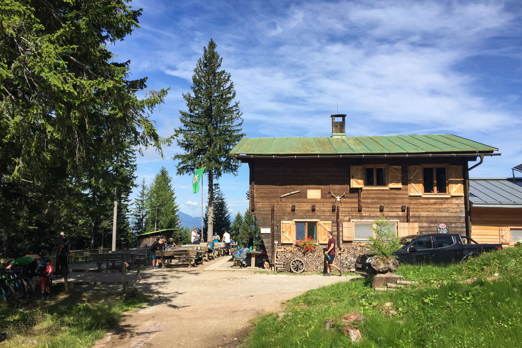 Etwa auf halbem Weg ins Tal liegt die Bertahütte. Wir stärken uns hier mit Kärntner Köstlichkeiten und steigen danach noch ins Tal ab. Wer hier schon müde Beine hat und nicht mehr ins Tal absteigen möchte, kann die Tour auch auf zwei Tage aufteilen und einmal auf der Bertahütte nächtigen. Man könnte somit den Abstieg auf zwei Tage aufteilen, um genug Zeit zu haben. Alternativ kann man die Tour auch in die andere Richtung gehen und den Aufstieg auf zwei Tage aufteilen, also an einem Tag zur Bertahütte aufsteigen und am Folgetag den restlichen Anstieg auf den Mittagskogel absolvieren und dann über den Grat bis zum Annahüttensattel und weiter talwärts absteigen.