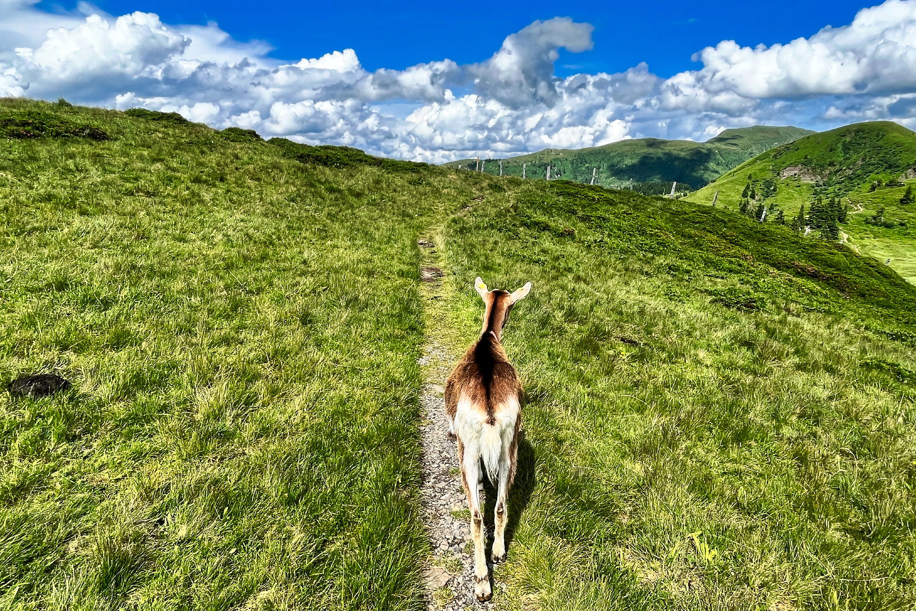 Am heutigen Tag haben wir 14 Kilometer vor uns und gehen über den Poludnig. Dazu folgen wir dem Wegweiser bei der Karte gegenüber der alten Käserei. Es ist auch möglich über den Egger-Alm-See und die Dellacher Alm zu gehen, was bedeutet, dass man sich die 600 Höhenmeter im Aufstieg und 500 Höhenmeter im Abstieg (und die schöne Aussicht) erspart. Es gibt noch einen zweiten optionalen Gipfel, auf dem es sich aber hervorragend Pause machen lässt, und zwar den Starhand (je 100 Höhenmeter im Auf- und Abstieg). Geht man wie wir über beide Gipfel, hat die Etappe circa 1.430 Höhenmeter im Aufstieg, 1.320 Höhenmeter im Abstieg und dauert circa 6 Stunden.