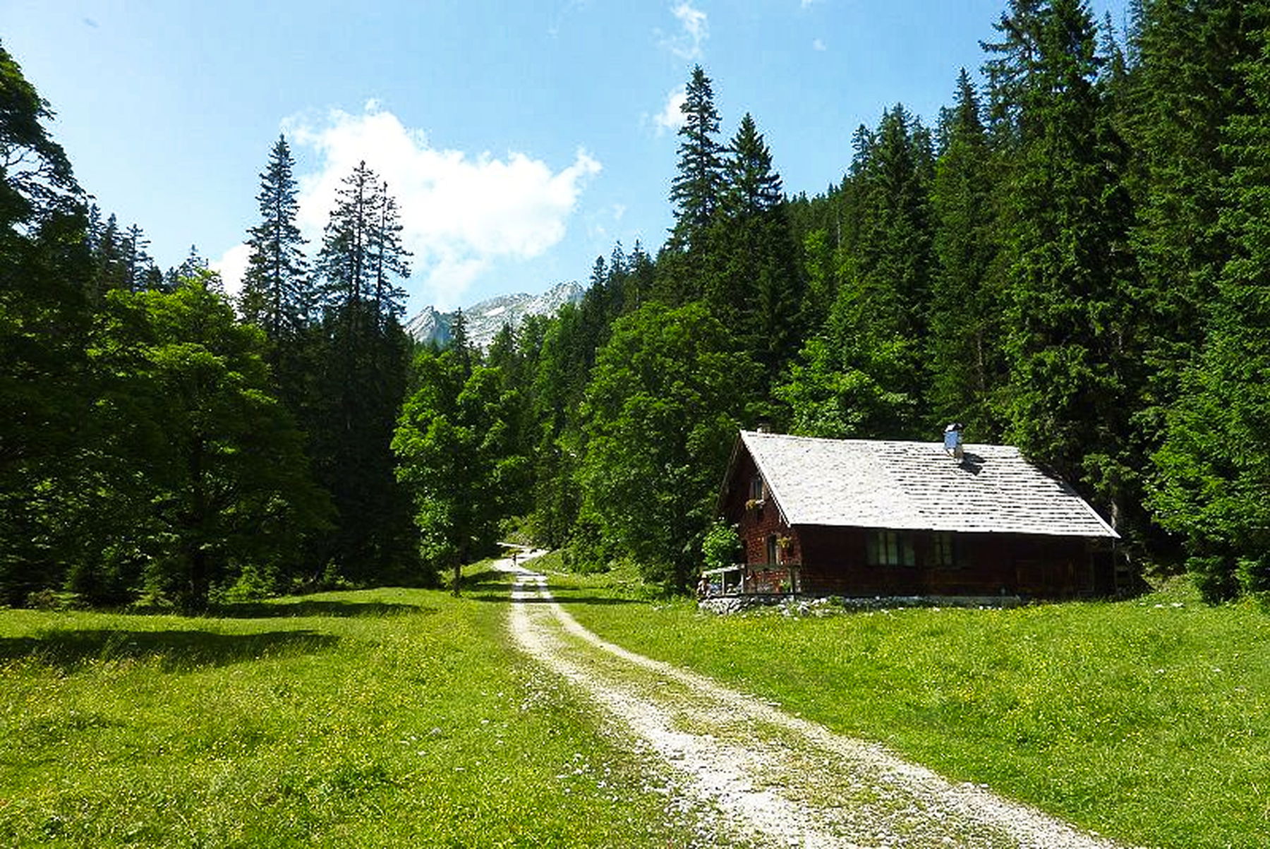 Wir folgen dem Johannistal nach Norden, bis wir auf die Mautstraße treffen, die von Hinterriß in die Eng führt. Über Asphalt geht es kurz durch Hinterriß (928 Meter) hindurch. Unmittelbar nach dem Ort, vor der Brücke über den Rißbach, zweigt links eine Forststraße ab, die uns über die Krinner-Kofler-Hütte und Vereineralm (1.406 Meter, Einkehrmöglichkeit) nach Mittenwald führt. Zunächst steigt unser Weg bis zur Vordersbachau (1.263 Meter) an, um dann um gut 150 Höhenmeter abzufallen und das Bachbett ohne Brücke zu queren, bevor es einen kleinen Anstieg zur Vereineralm zu überwinden gilt. Von hier aus lässt es sich entspannt nach Mittenwald bergab rollen.