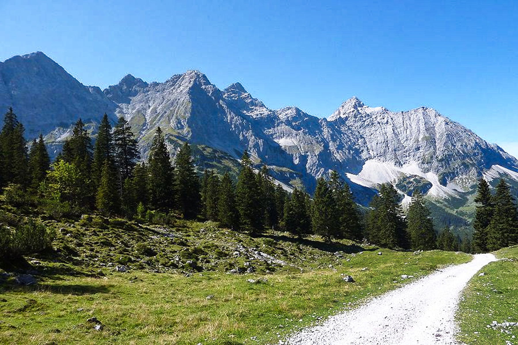 Von Scharnitz aus radelt man über den Parkplatz in der Länd gleich nach der Isarbrücke links bergauf Richtung Karwendeltal, wodurch Wanderern gegenüber die 18 Kilometer bis zum Karwendelhaus praktisch abgekürzt werden können. Am Ende des wildromantischen Tals geht es in ein paar Kehren steil bergauf zum Karwendelhaus (1.765 Meter), wo wir das Fahrrad abstellen. Hier zweigt ein gut markierter Steig in Richtung Südosten mit Blick aufs Hochalmkreuz ab. Man folgt diesem Steig zunächst über felsiges Gelände und durch Latschen, dann durch das Schlauchkar hinauf auf den Schlauchkarsattel und zum Birkkar-Notbiwak. Die winzige Hütte liegt spektakulär unterhalb des Gipfels hoch oben auf dem Kamm der Karwendel-Hauptkette. Der letzte Teil der Tour auf den Gipfel ist etwas schwieriger und erfordert den Einsatz der Hände – er sollte darum nur von geübten Wanderern in Angriff genommen werden. Belohnt wird die Kraxelei aufs Dach des Karwendels mit einem sagenhaften Ausblick. Der Abstieg verläuft entlang derselben Route.