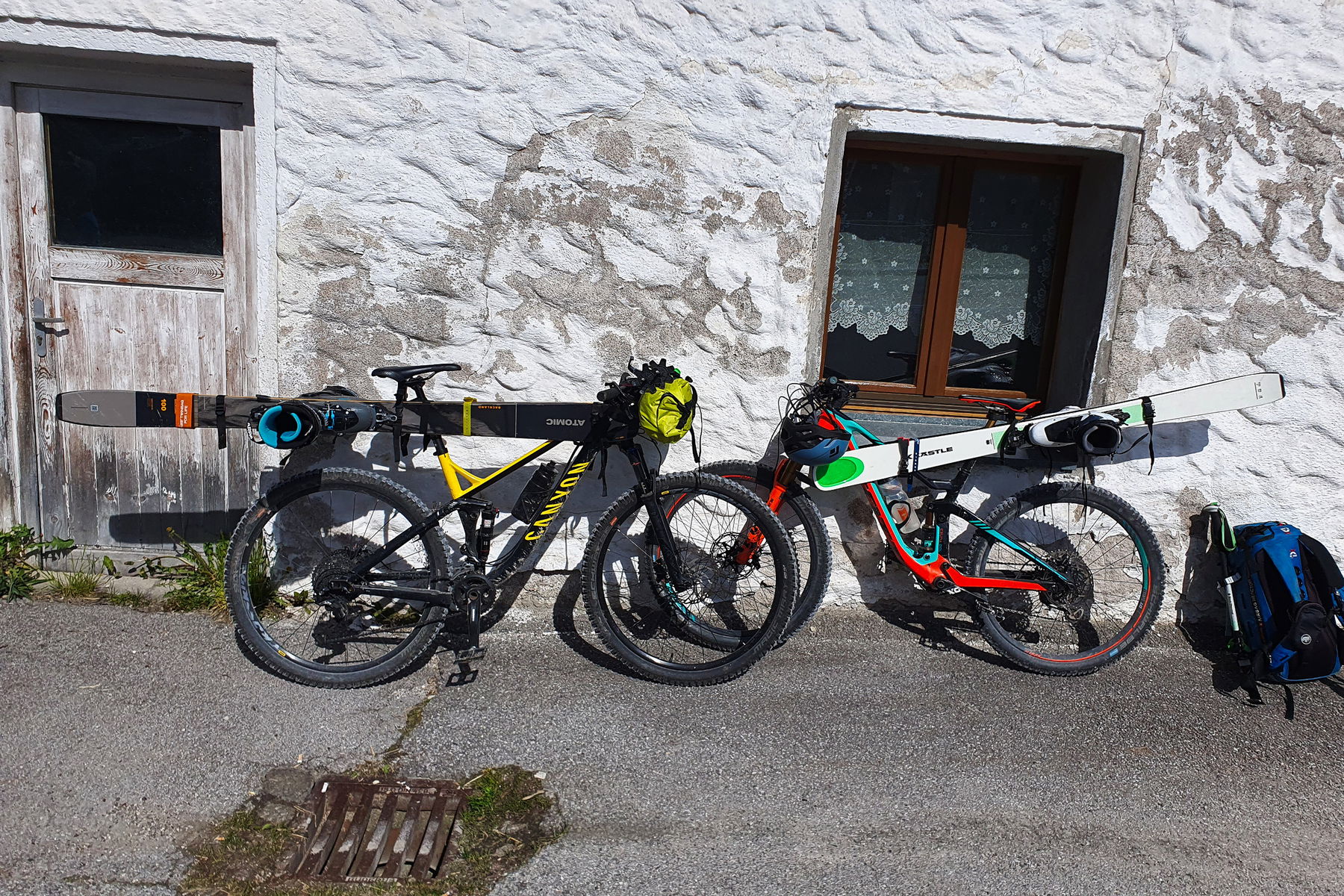 Unser Plan ist, so weit mit dem MTB zu fahren, wie es die Schneelage zulässt. Anfang Mai 2023 ist die Schneelage nur noch in den hohen Lagen vielversprechend, in den mittleren Lagen schon eher bescheiden. So kommen wir recht weit mit dem MTB. Ein paar Kehren unter dem von Weitem sichtbaren Karwendelhaus stellen wir unsere Räder bei einem Brunnen ab. Denn ab hier ist genug Schnee, dass wir mit Ski weitergehen können.